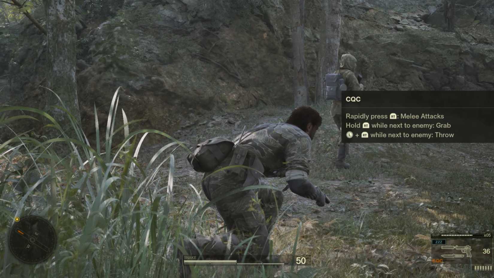 したがって、木の近くに行くと、「登山」ボタンがポップアップし、敵の後ろに忍び寄ると「CQC」プロンプトが表示されます。新しいシステムは、敵をつかむときに最も役立ちます。敵とできることがたくさんあるので、どのボタンが何をするかを忘れがちです。ボタンプロンプトを含めると、これがはるかに簡単になります。ただし、プロンプトは没入感を台無しにする可能性があります。