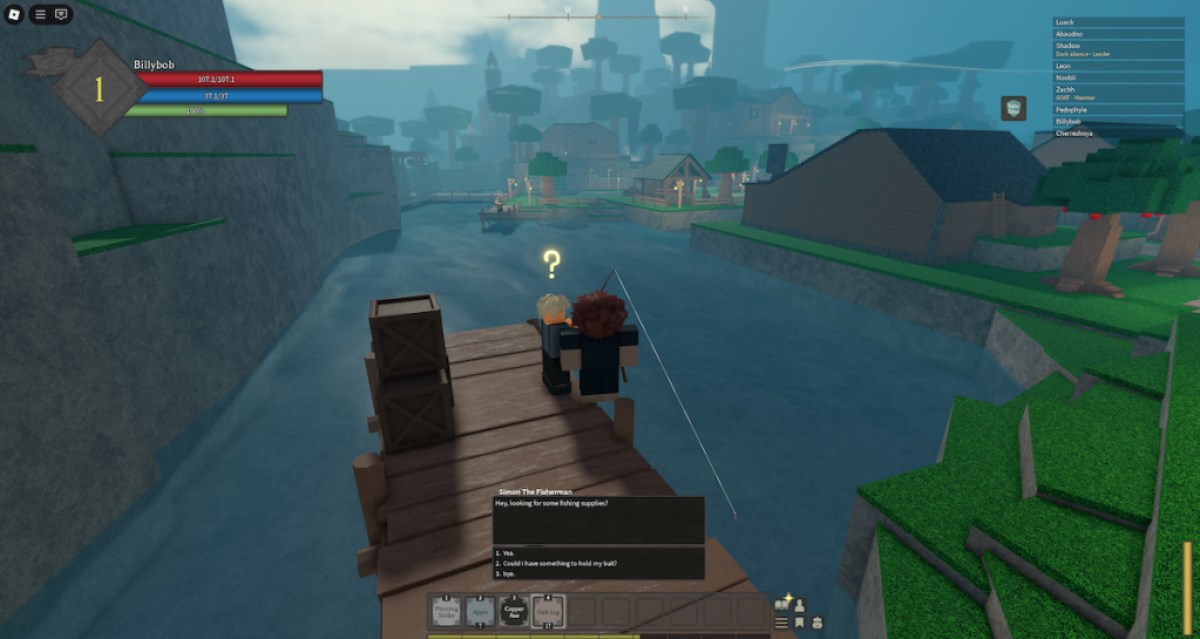 - それを行う方法:サイモンは申し出ます釣りの基本を教えてください。初心者の釣り竿と彼から餌を購入し、棒を装備し、近くの水にラインを投げます。浮きの周りに波紋が見えたら、クリックしてキャッチをリールします。このクエストを完了します食品を提供し、漁業整備士を紹介します。