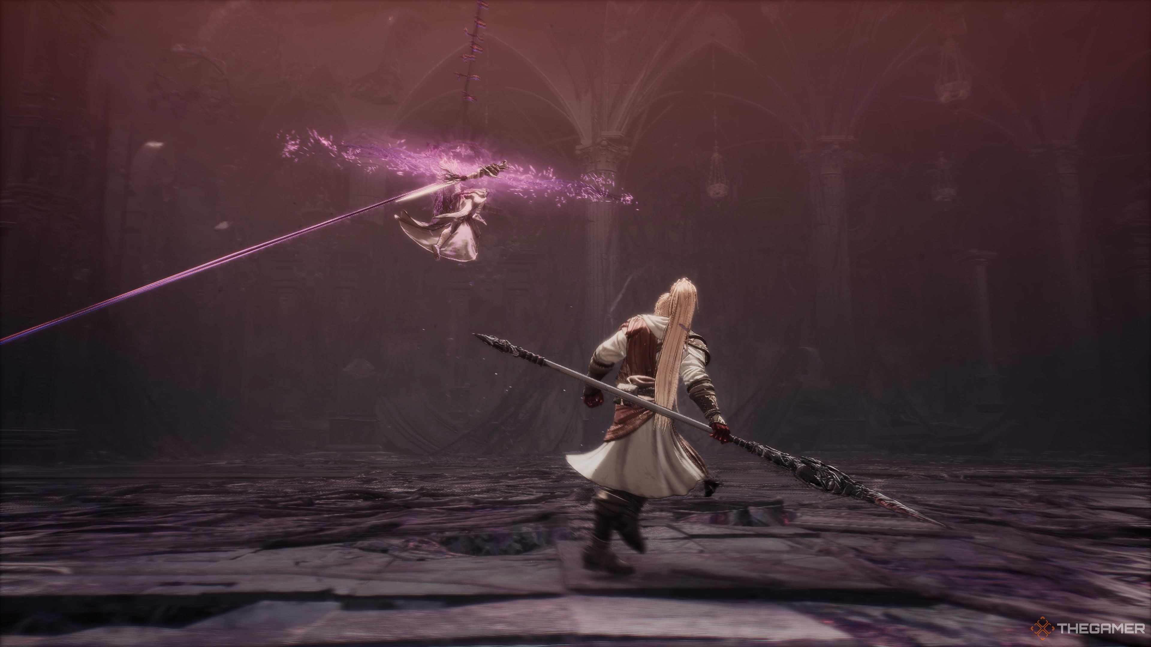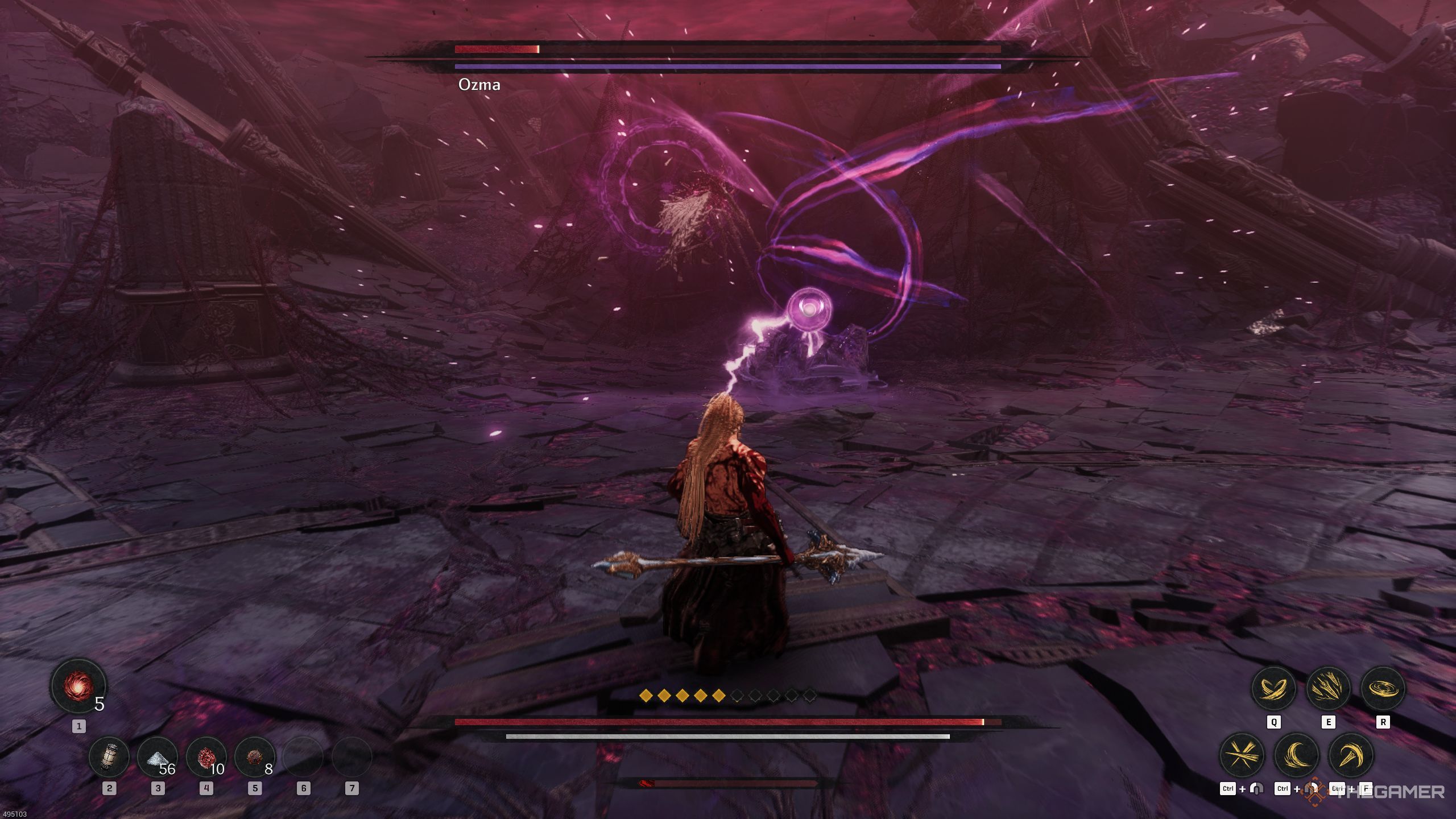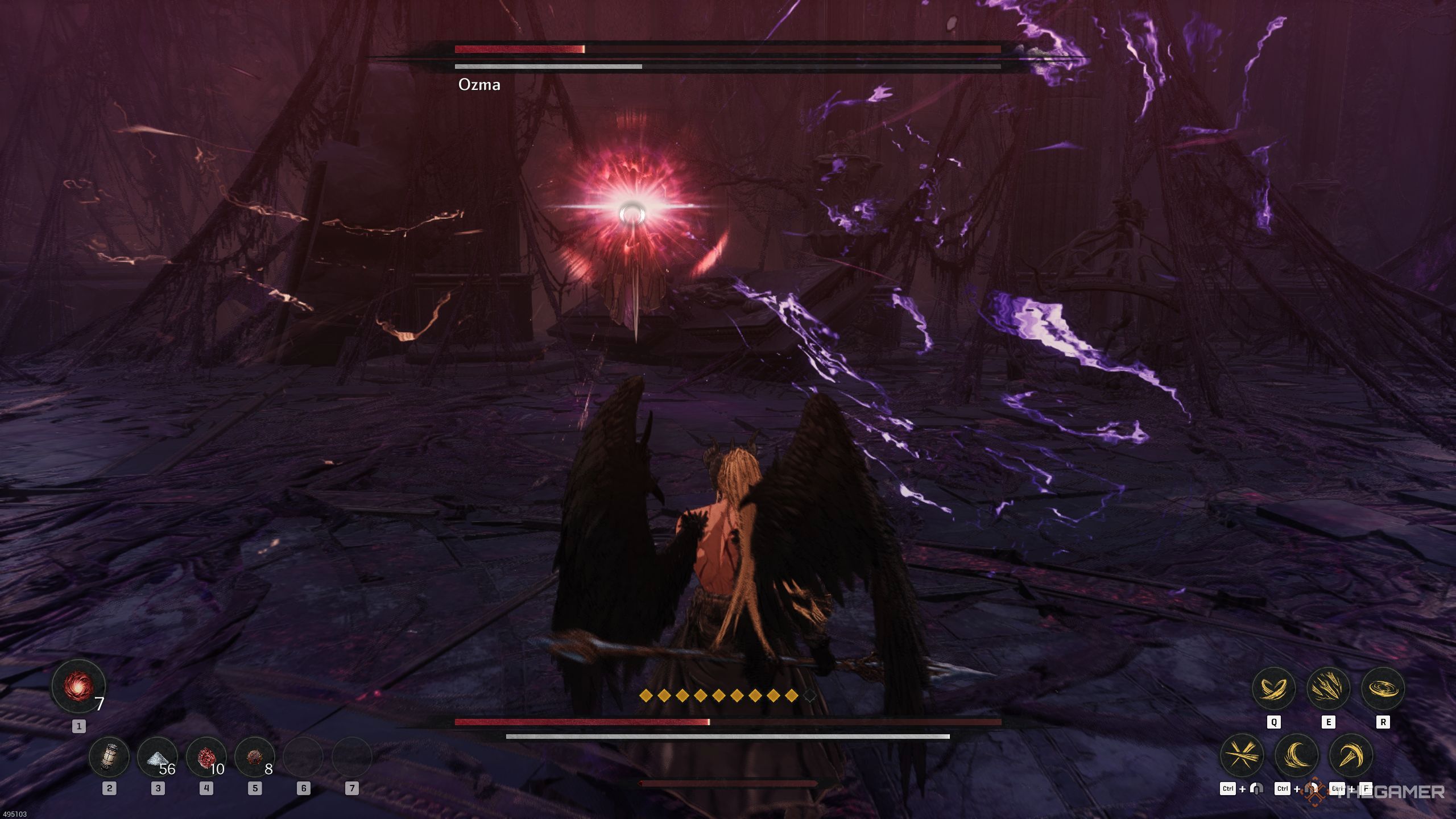しかし、時にはスタッフのスイングの代わりに、彼は3ヒットのウィングコンボであなたを襲うでしょう。あなたは紫のエネルギーのバーストに迫り来るでしょう。これらの翼のスイングのそれぞれは非常に遅れています。最初の2つのヒットの間には、約2秒の一時停止があります。彼らはガードするのは難しくありませんが、その遅延は間違いなくあなたのタイミングを台無しにする可能性があります。 3回目のスイングの前の一時停止は、はるかに長いです - 2秒の遅延に近いです。ただし、この3回目の攻撃を守るためのブリンクの報酬は、オズマをよろめかせるため、かなり巨大です。