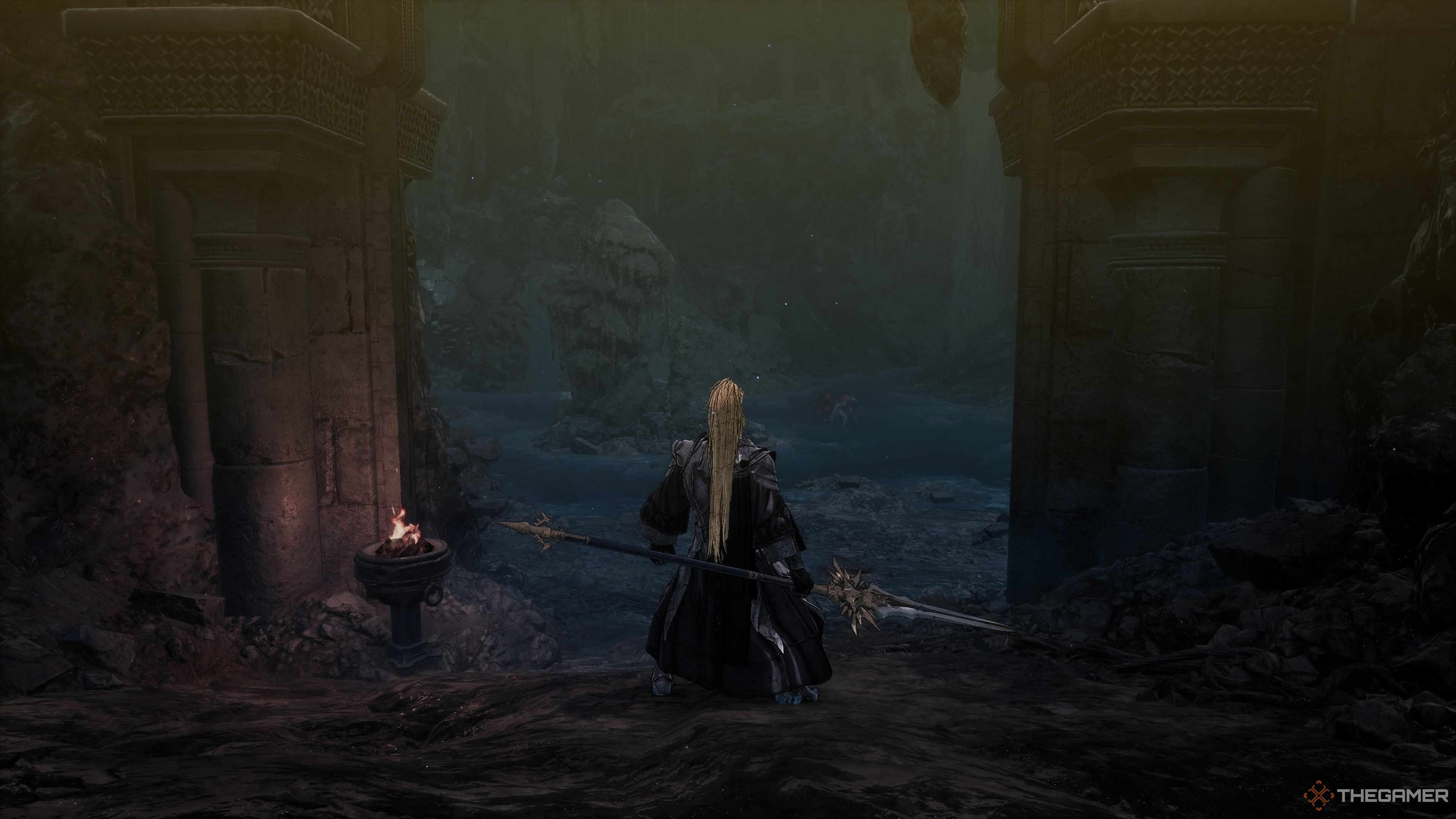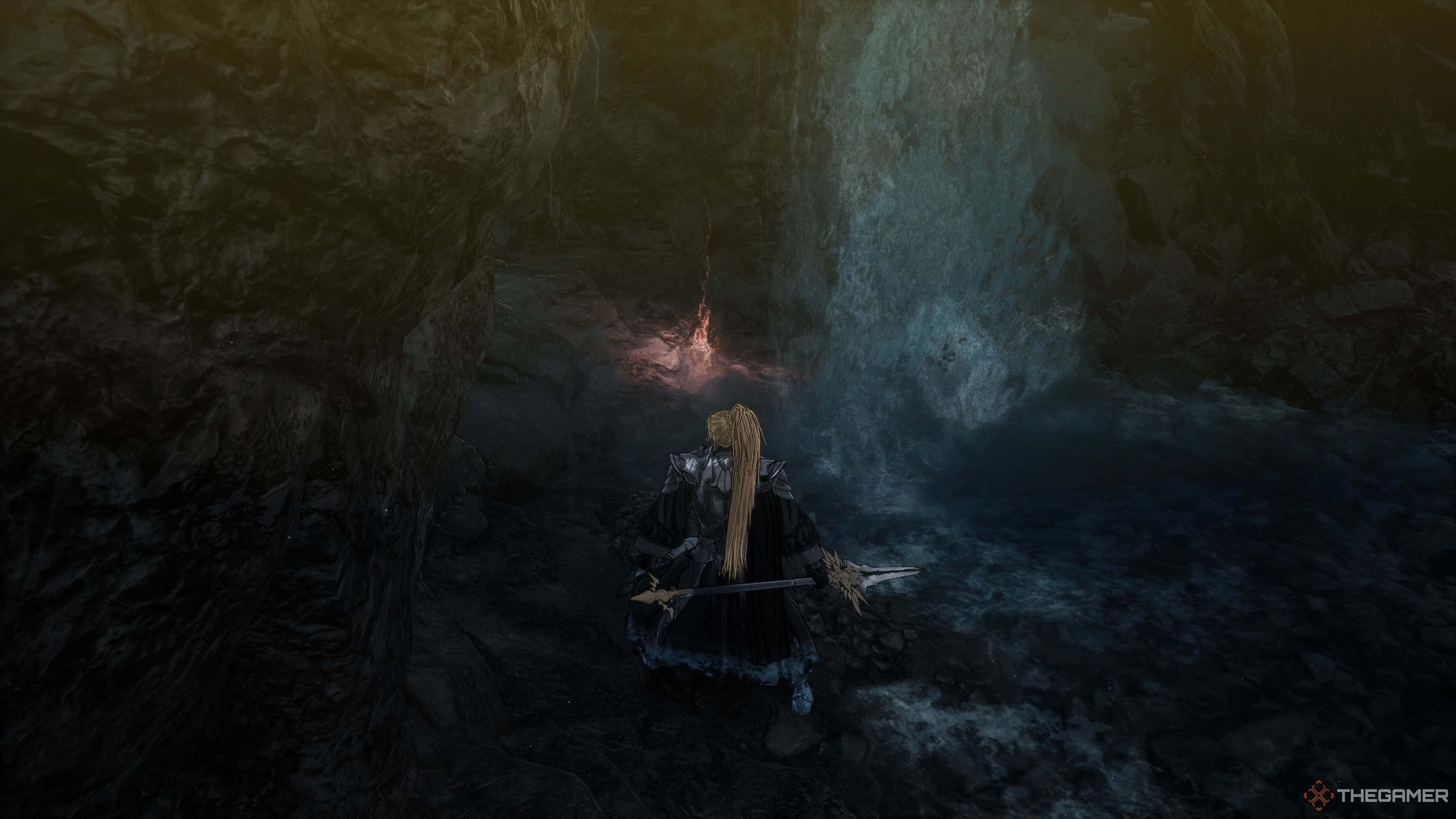 左の壁を追い続けると、3つが見つかります活力球と2意志力オーブ。気をつけてください、あなたが見る輝く死体は別のものです地下室の貪欲、だからジャベリンでそれらを取り出してください。近くの小川の中央にある岩の上には7つありますスピリット鉱石。