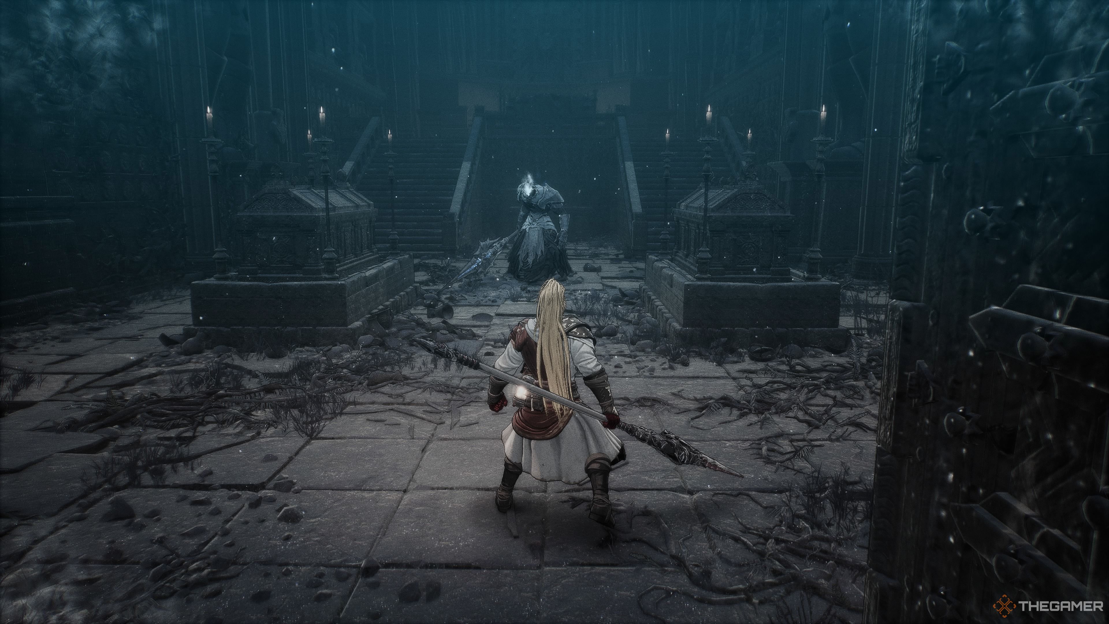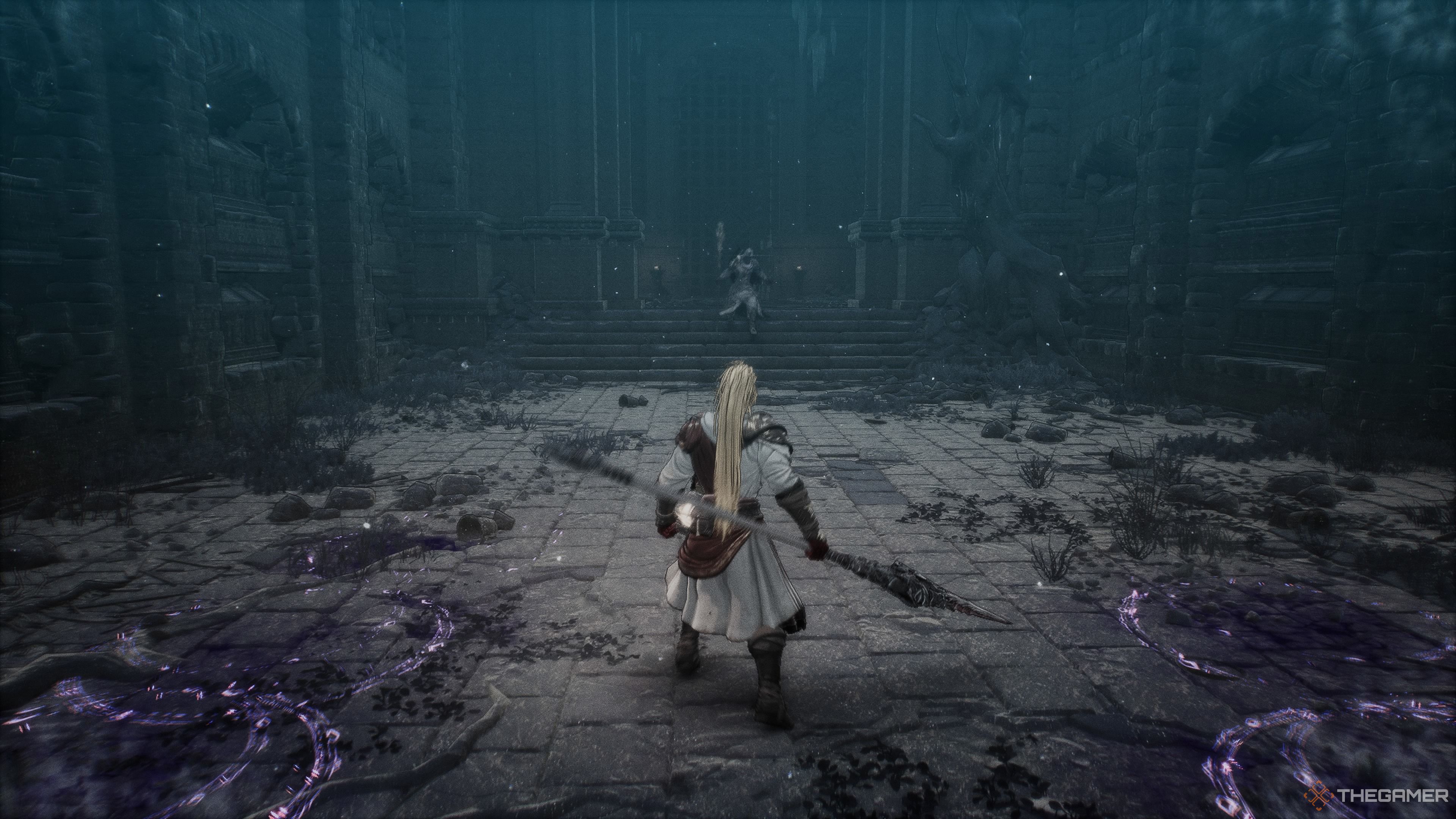 その奥の部屋に入り、有名なスペルブレードの影に遭遇するまでそれに従ってください。彼は、突き刺す攻撃を使用し、発射体にあなたの道を送るのが好きなタフなアンデッドの戦士の一人です。彼の突進攻撃が彼をかなり前方に運ぶ傾向があるので、彼から離れて、彼から離れて、あなたの側にかわしないでください。