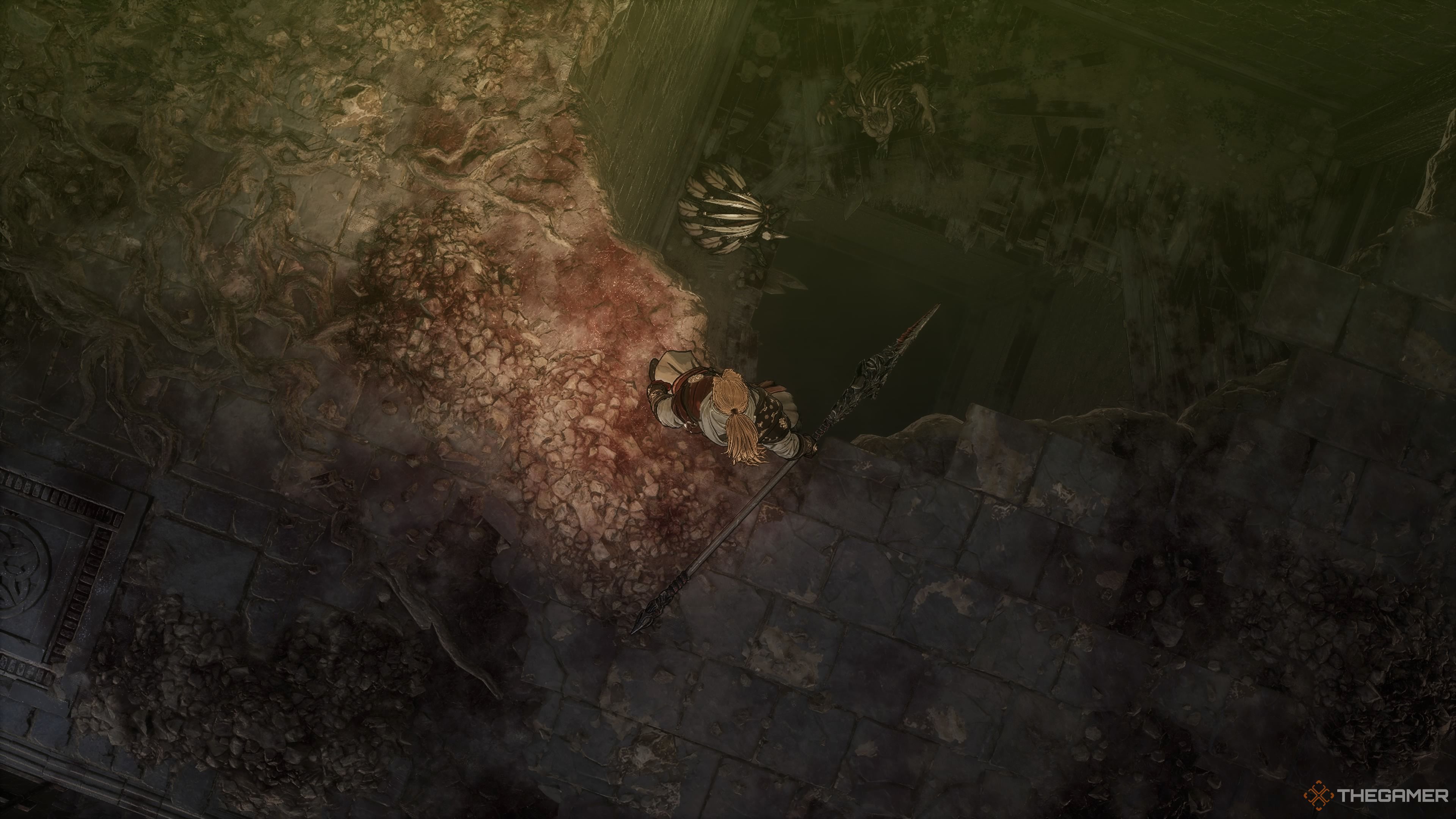入り口の左に、バリケードを過ぎて、地球のエンハンサーをつかみます。少しバックトラックして、オーバーハングのあるエリアを探します。端を見てみると、下に石のプラットフォームが表示されます。目指してくださいシャーマンまたは追跡者にドロップ攻撃を行うストーカーについて。さて、このエリアの残りの部分をクリアします。