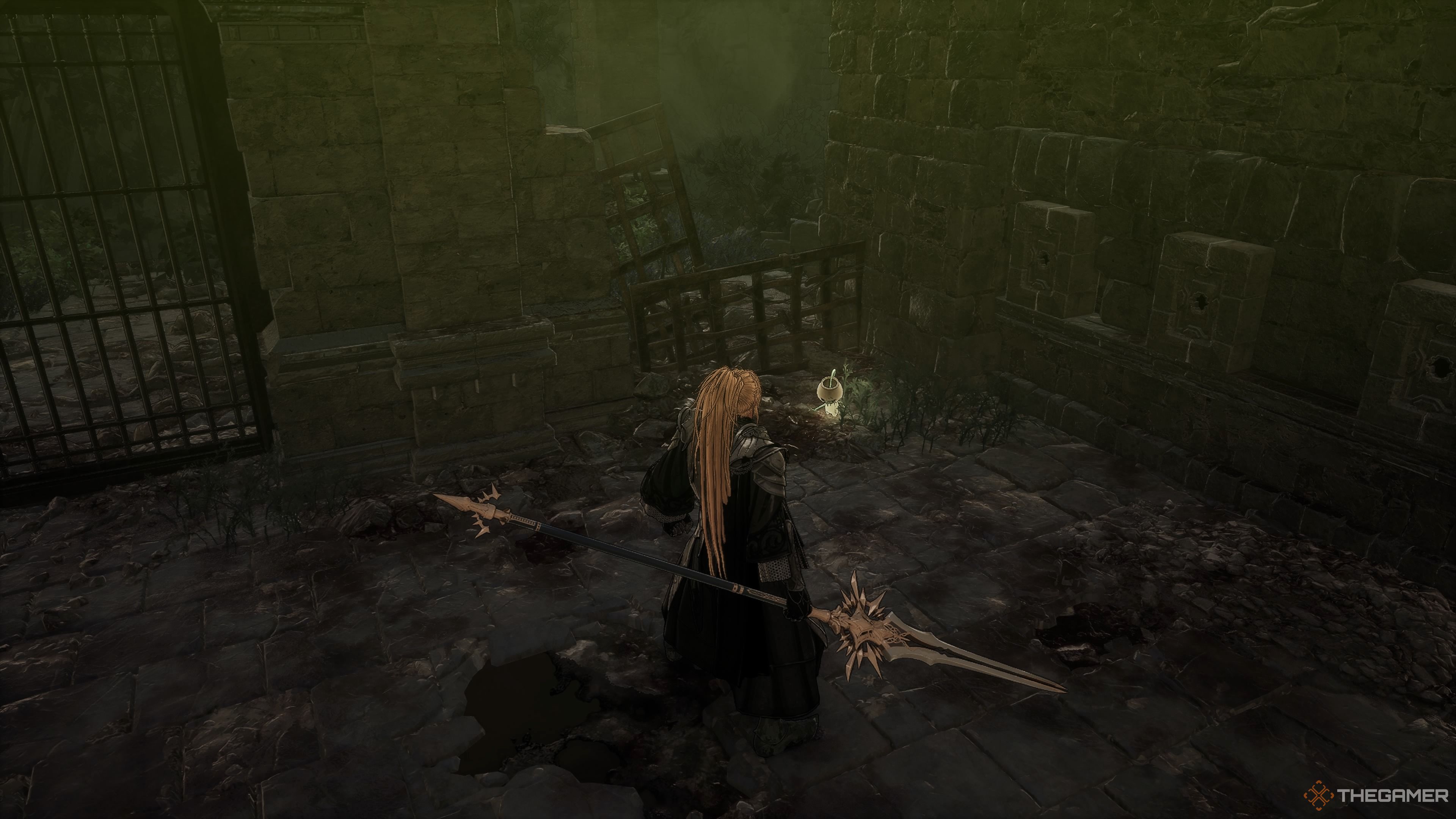 階段を下ってください。前進する唯一の道ははしごを下ることであるように見えるかもしれませんが、そうではありません。壁をはしごの右側に攻撃します。あなたは穴を開けて最初のものを明らかにすることができるでしょうソウルストーン(1/2)。