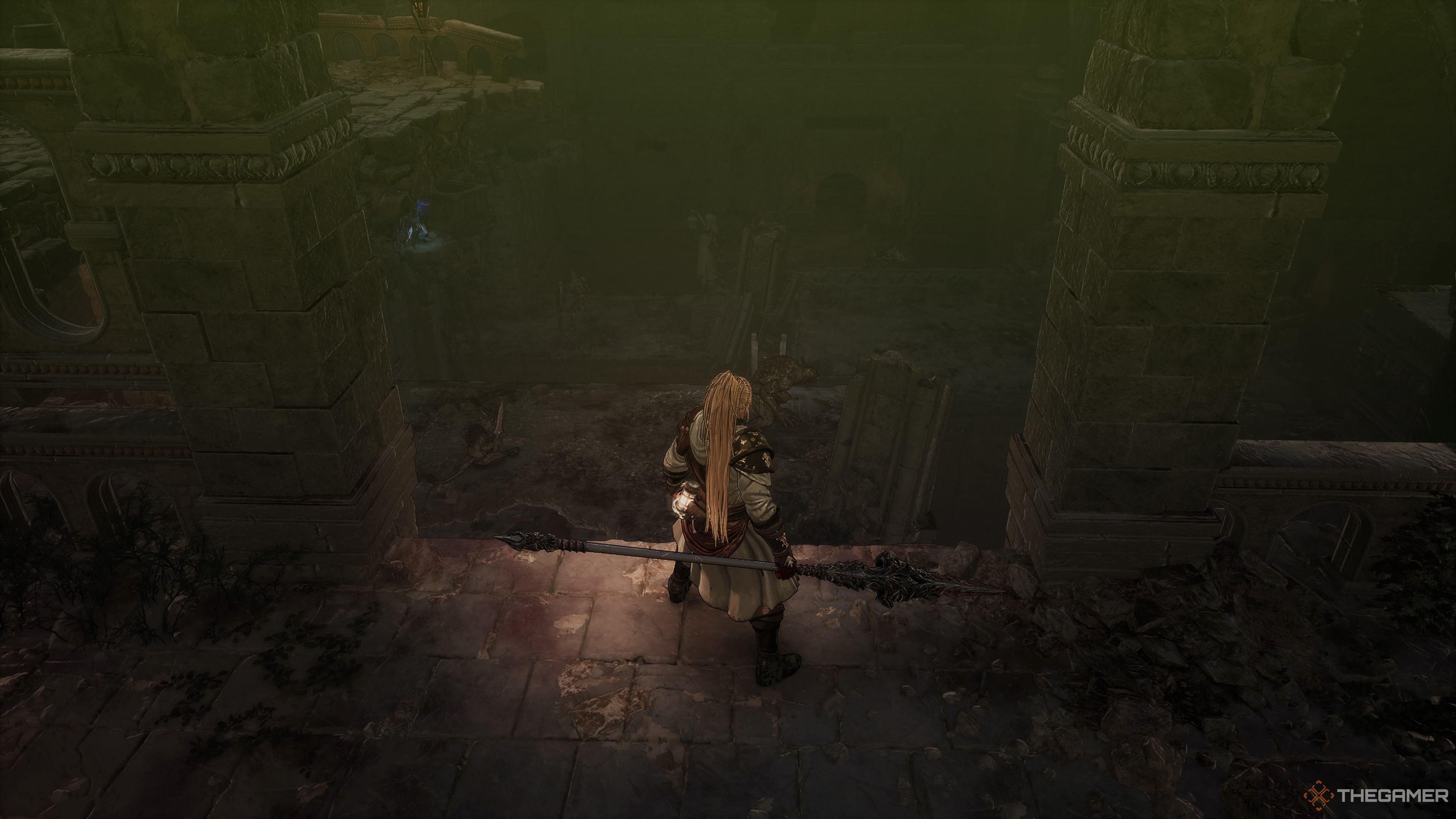 ここから階段を下り、廊下を通り抜けます。矢印のtrapに注意してください。さらに、ホールをパトロールするアンデッドの暗殺者を探してください。最初の左を取り、をつかみますファイアクレンジングポーション。廊下をまっすぐに向かい、その最後の矢のtrapに注意してください。左に出ると、別の隆起した橋に面します。チェーンを切り取って橋を渡り、つかむ不安定なソウルティアストーン。