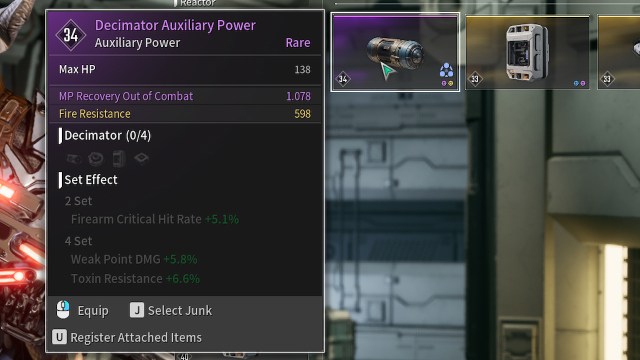 | デシマーセット | レア | 2セット: 銃器クリティカルヒット率 +5.1% フルセット: 弱点DMG +5.8% 毒素耐性 +6.6% |