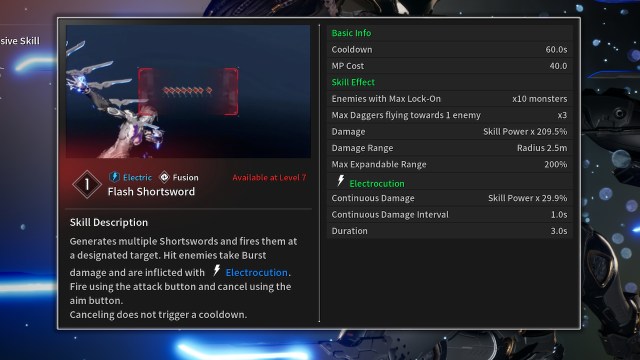 - フラッシュショートソード発砲する前に狙うことができる多数の発射体を生成します。赤いスクリーンが表示され、攻撃する敵の数を確認できます。発射体は敵に損傷を与え、感電を与えます。