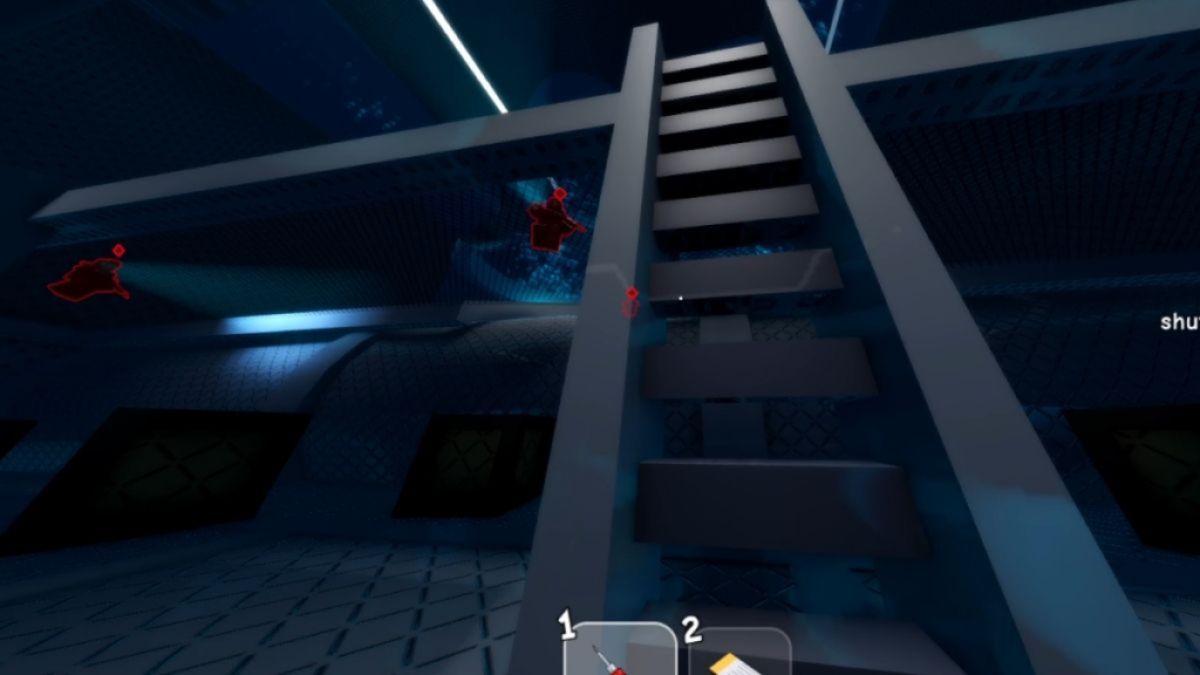 隣を開き、新しいセクションの右側の階段を登ります。ドアを再度スキャンすると、表示されます3人の警備員あなたの上のプラットフォームで。