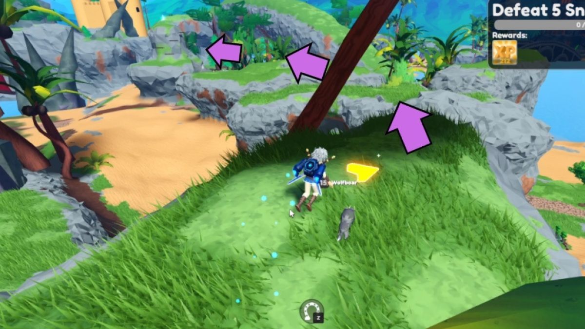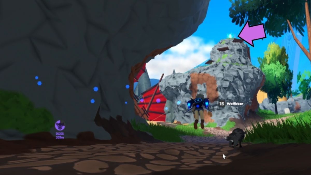 洞窟の右に行き、山の側面を登ります。グリーンゼロクリスタル山の山頂にいるので、見逃すことはできません。頭を下げて、風車に向かって行き、石に突き刺された船に到達するまで道をさらに下って行きます。