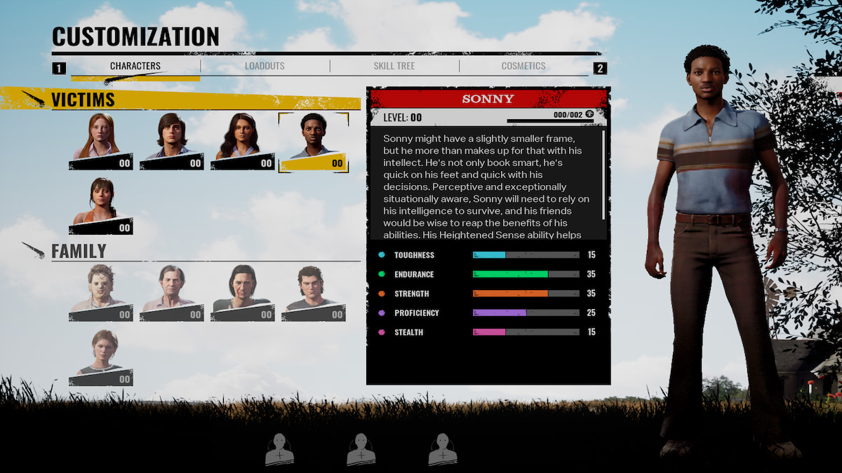 Sonnyの最良の属性は持久力です。これは、彼がどれだけのスタミナを持っているか、それがどれほど速く再生されるかを決定します。彼の高められた感覚能力は、彼が近くのノイズを強調することを許すことで、彼に殺人の家族に対して足を与えることができます。