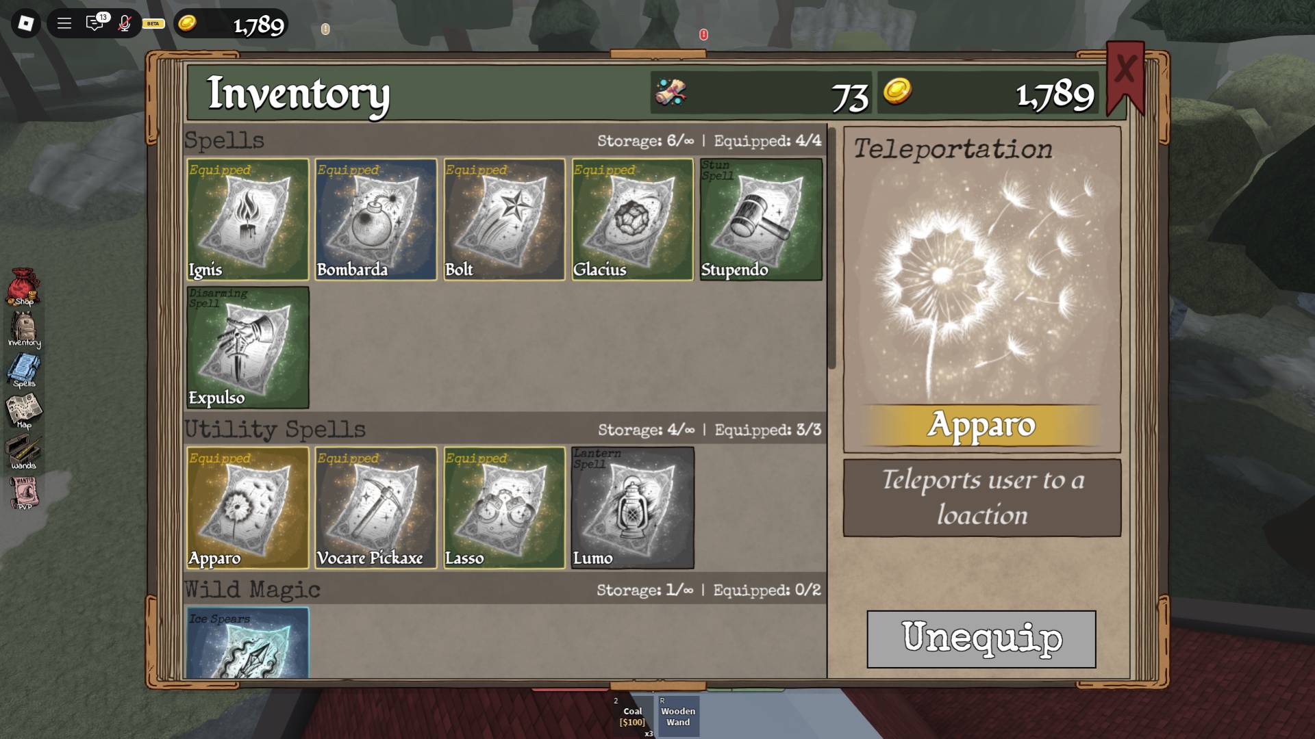 装備および装備を装備するには、をクリックしてくださいインベントリボタン左に。せいぜい持つことができます4つの呪文、3つのユーティリティスペル、 そして2野生の魔法装備。ほうき、杖、装備(帽子、ボディ、ケープ)はすべて、スロットを指定しています。機器のピースがボーナス統計を提供する場合、インベントリでクリックすると表示されます。