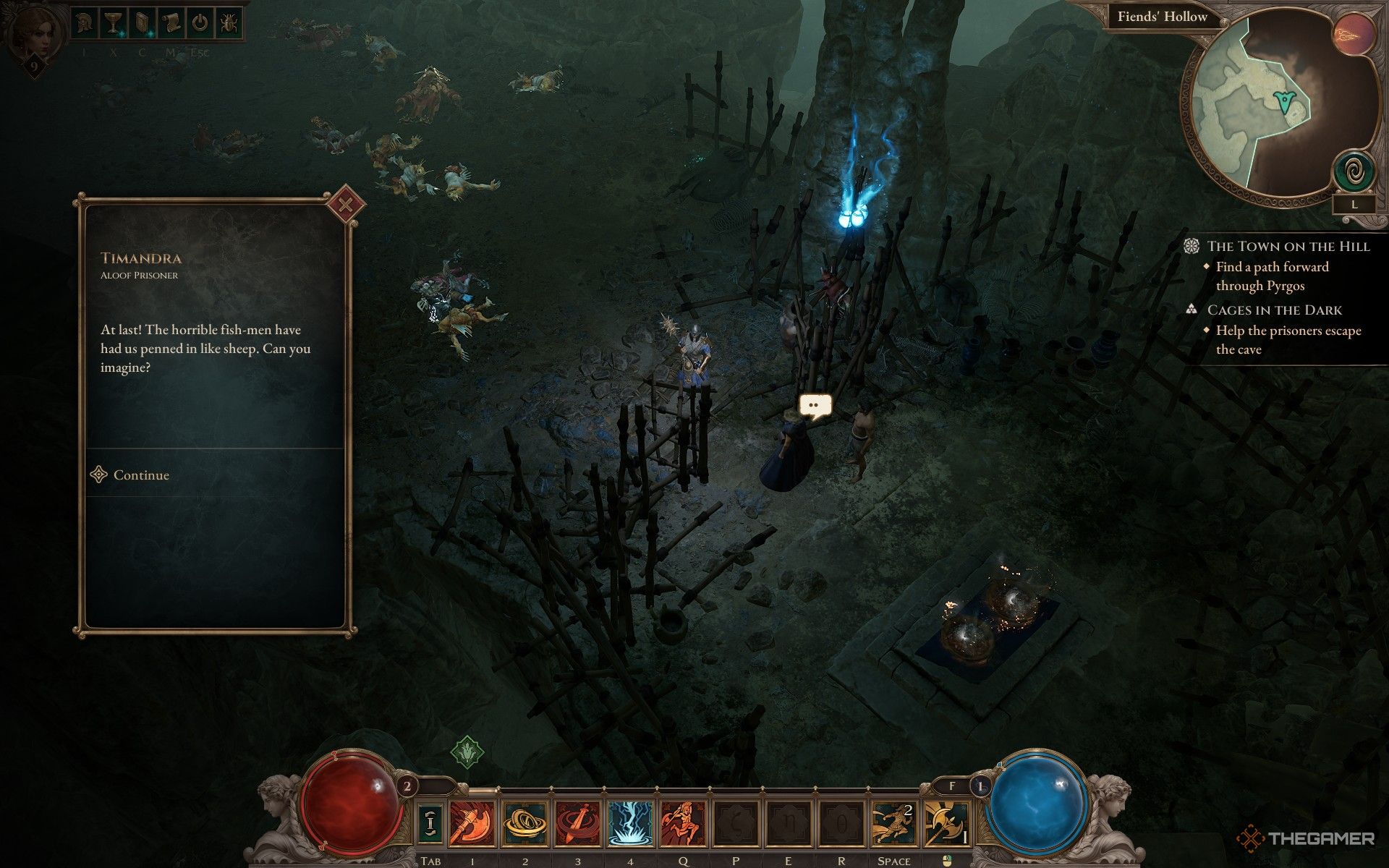Timandraと対話します、彼女の頭の上にスピーチアイコンを持って、元の捕虜との短いカットシーンを見て、シーンの終わりにタイタンクエスト2のダーククエストで洞窟を仕上げました。