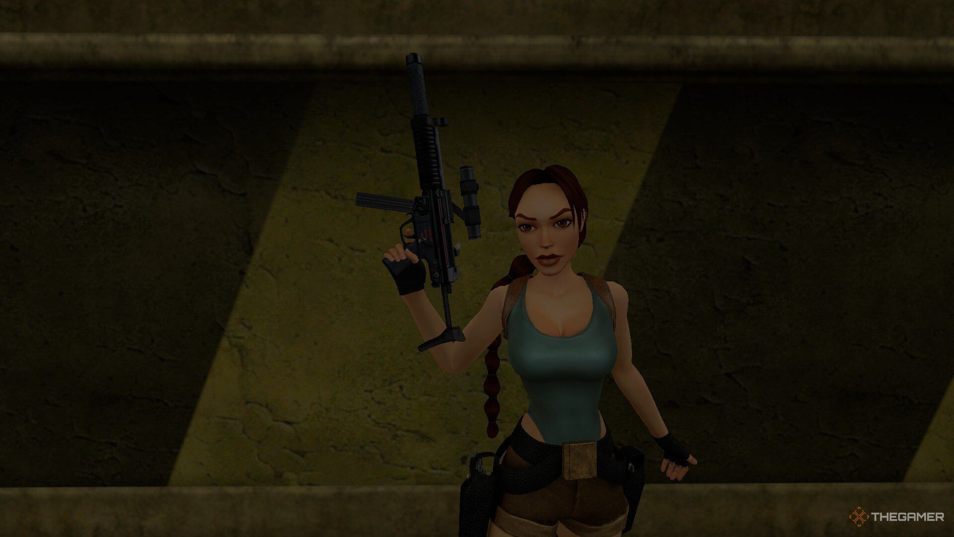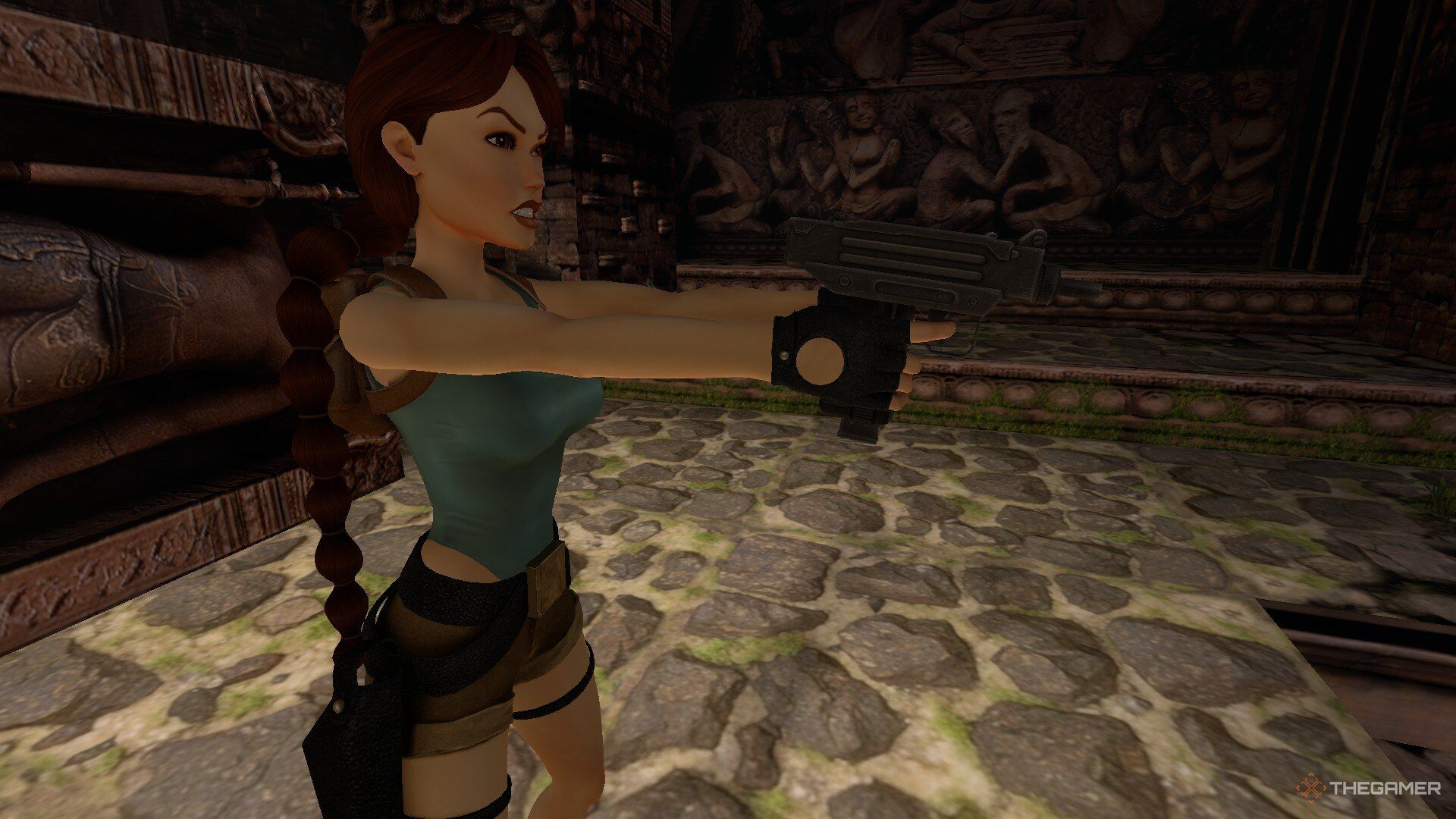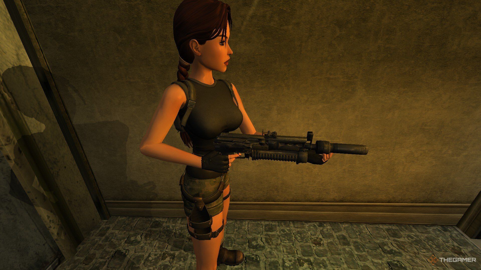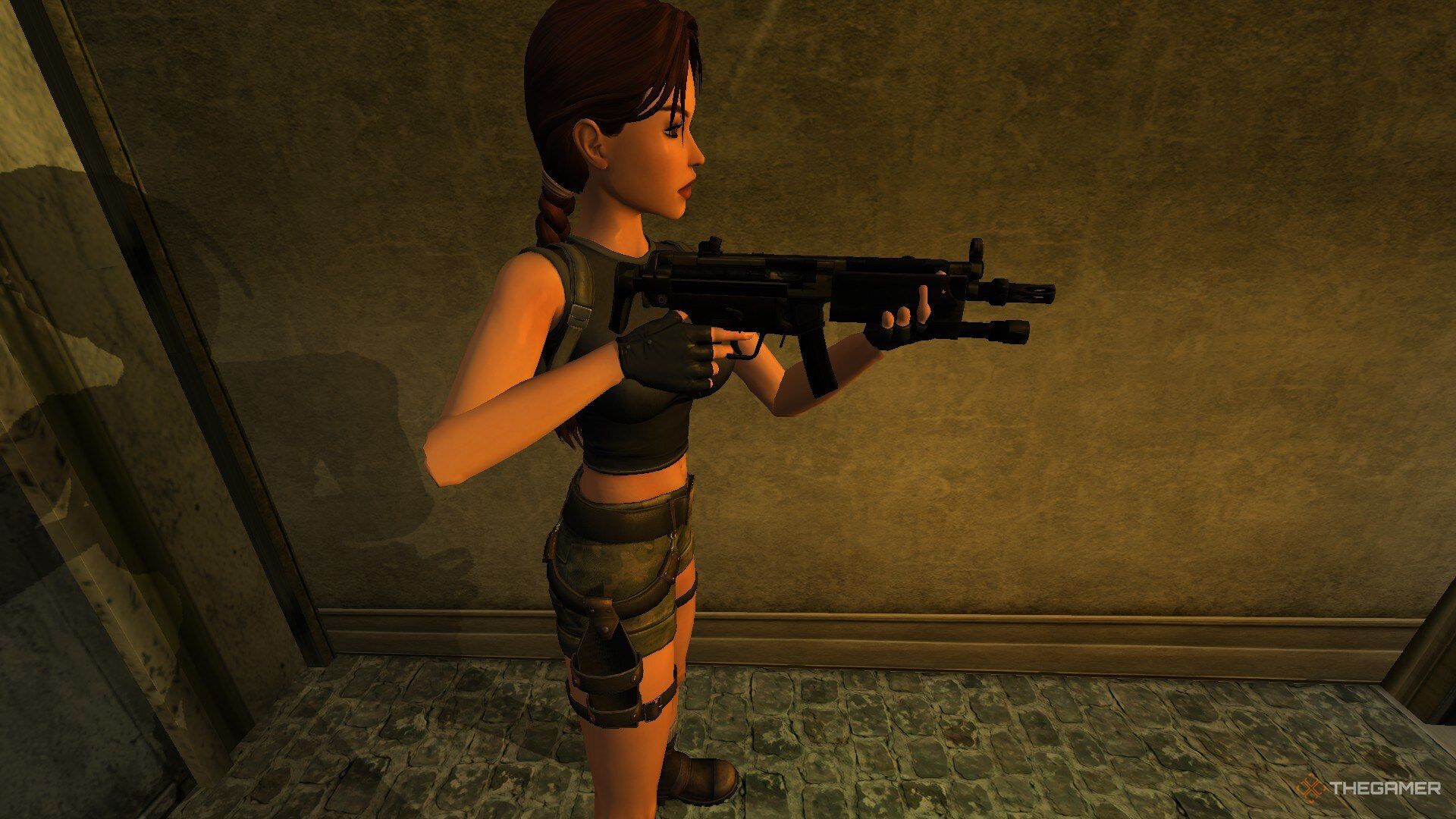 ララがピストルでレーザー視力を使用することを可能にする最後の啓示の古典的なPCバージョンには、2つを組み合わせることができませんでした。この便利なバグはリマスターでパッチをかけられたようです。