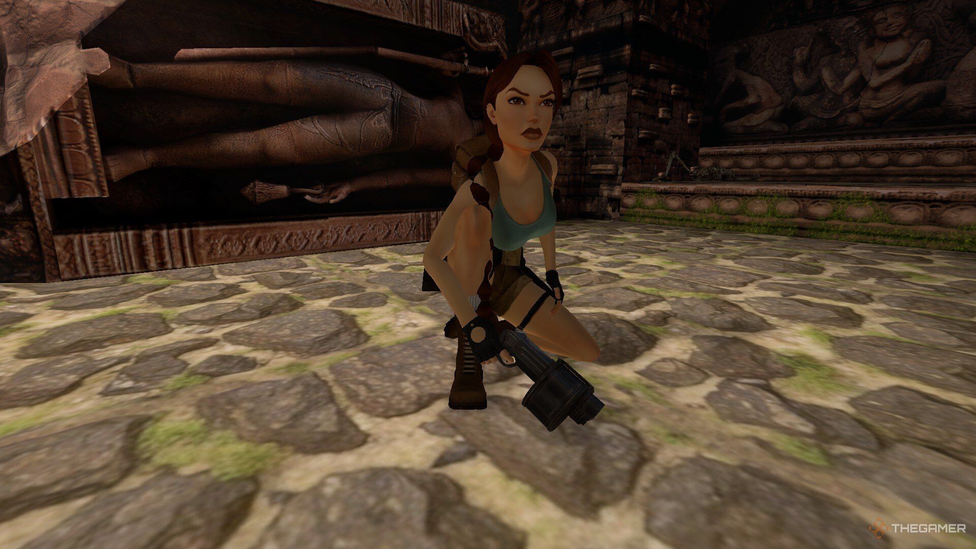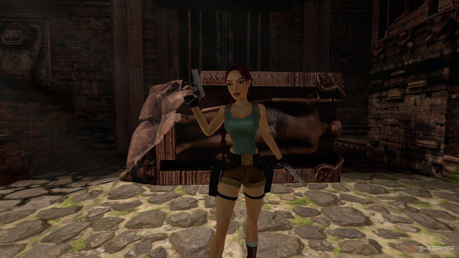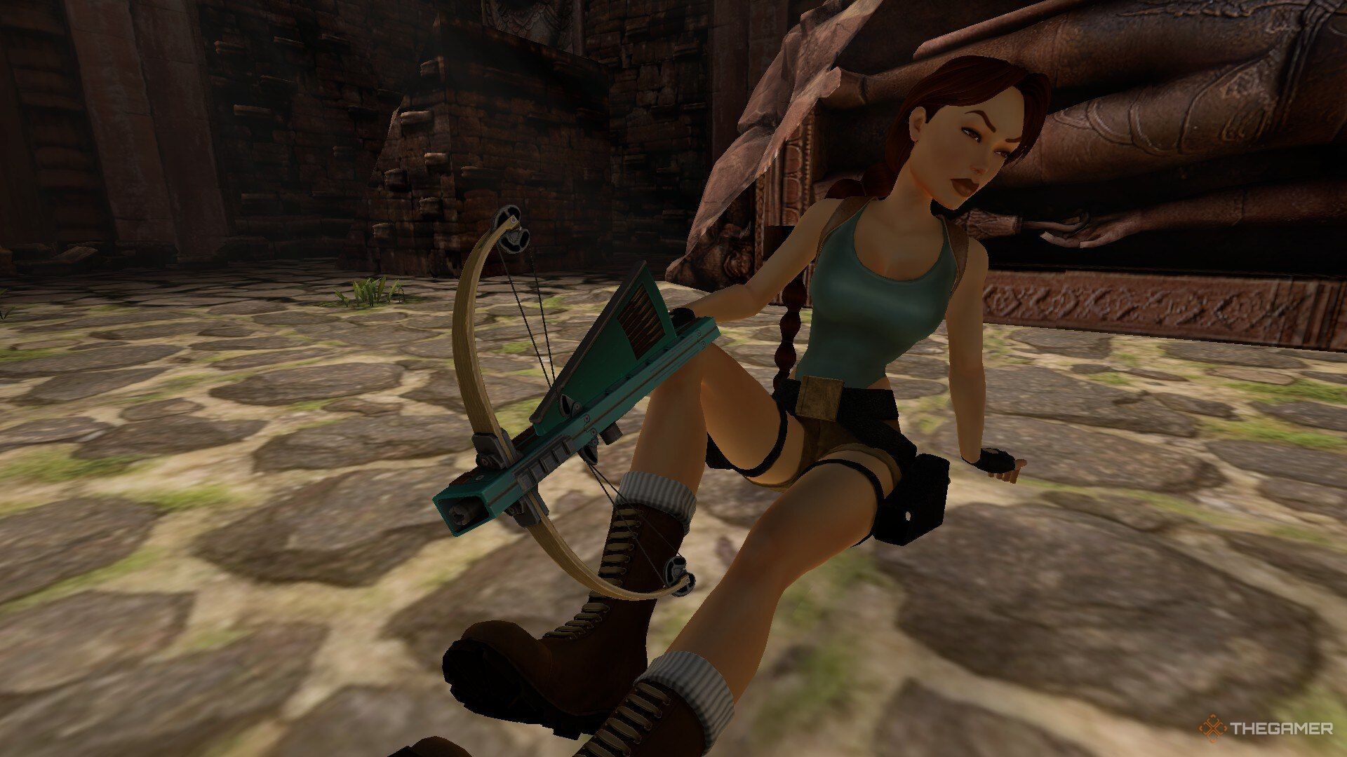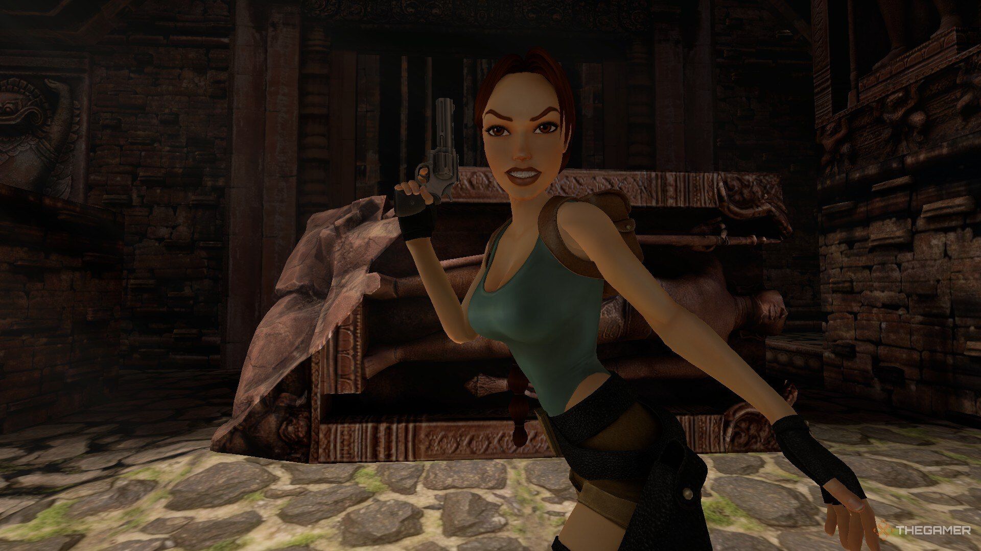 ララがピストルでレーザー視力を使用することを可能にする最後の啓示の古典的なPCバージョンには、2つを組み合わせることができませんでした。この便利なバグはリマスターでパッチをかけられたようです。