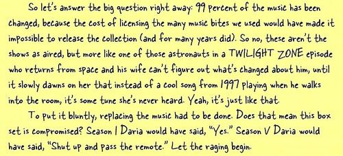 悲しいかな、DVDリリースには、トラックの元の配置がありませんでした。なぜ?クリエイターのグレン・アイヒラーには、リリースに関する完全なメモが含まれています。率直に言って、彼は言った、「音楽を置き換える必要がありました。それはこのボックスセットが妥協したことを意味しますか?シーズン1のダリアは「はい」と言っていたでしょう。シーズンvダリアは、「黙ってリモコンを通過する」と言っていたでしょう。」