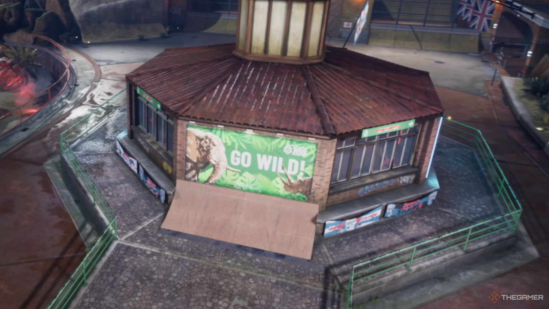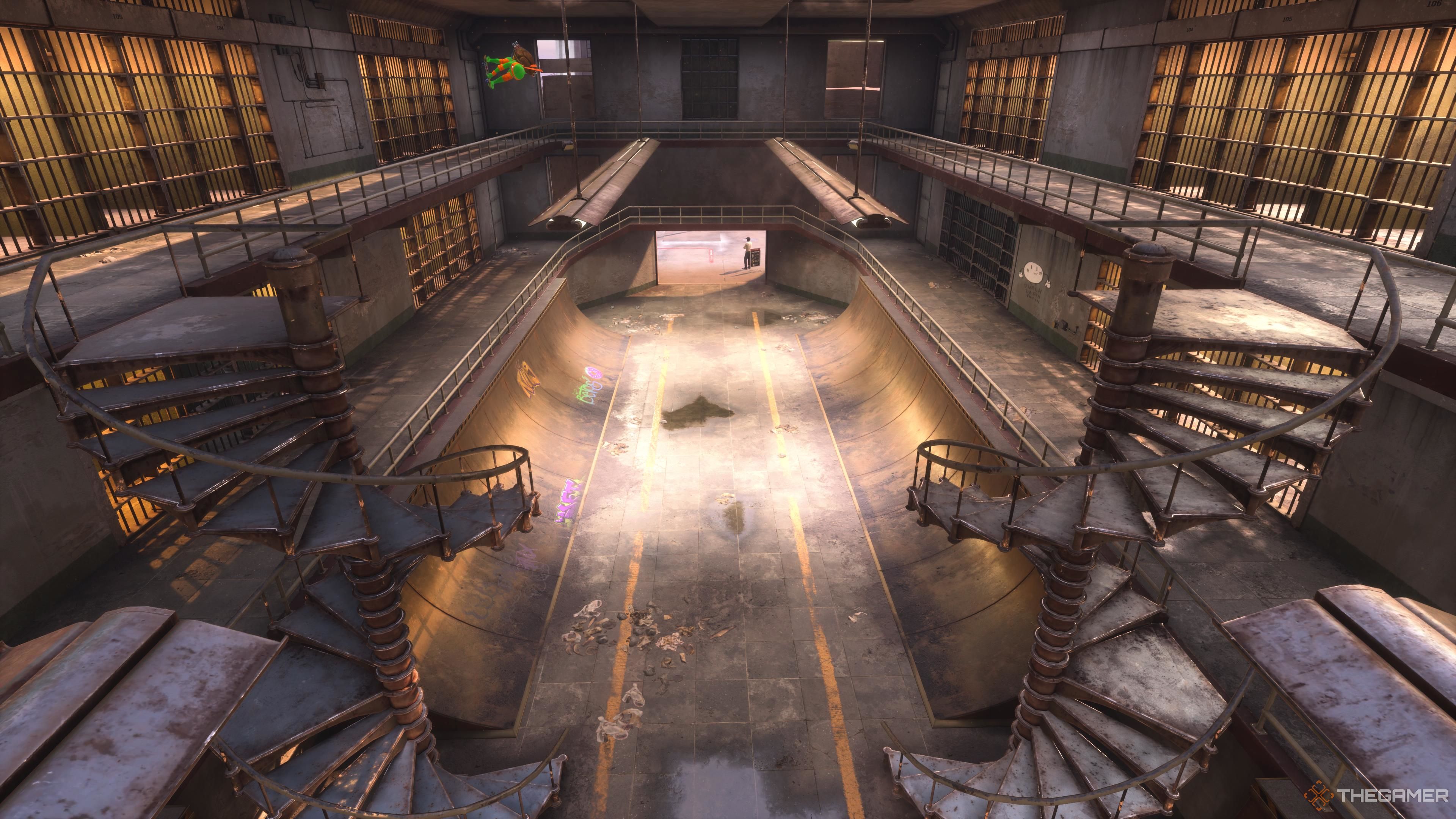 ここから、あなたと同じように粉砕して、前方の道をたどってください。あなたはスケーターのその巨大な兆候を通り過ぎて粉砕し、ケーブルを握りしめ、そして下の壁に巨大な穴が開けられます。その穴をスケートして、他のスケートパーク全体に到達してください。