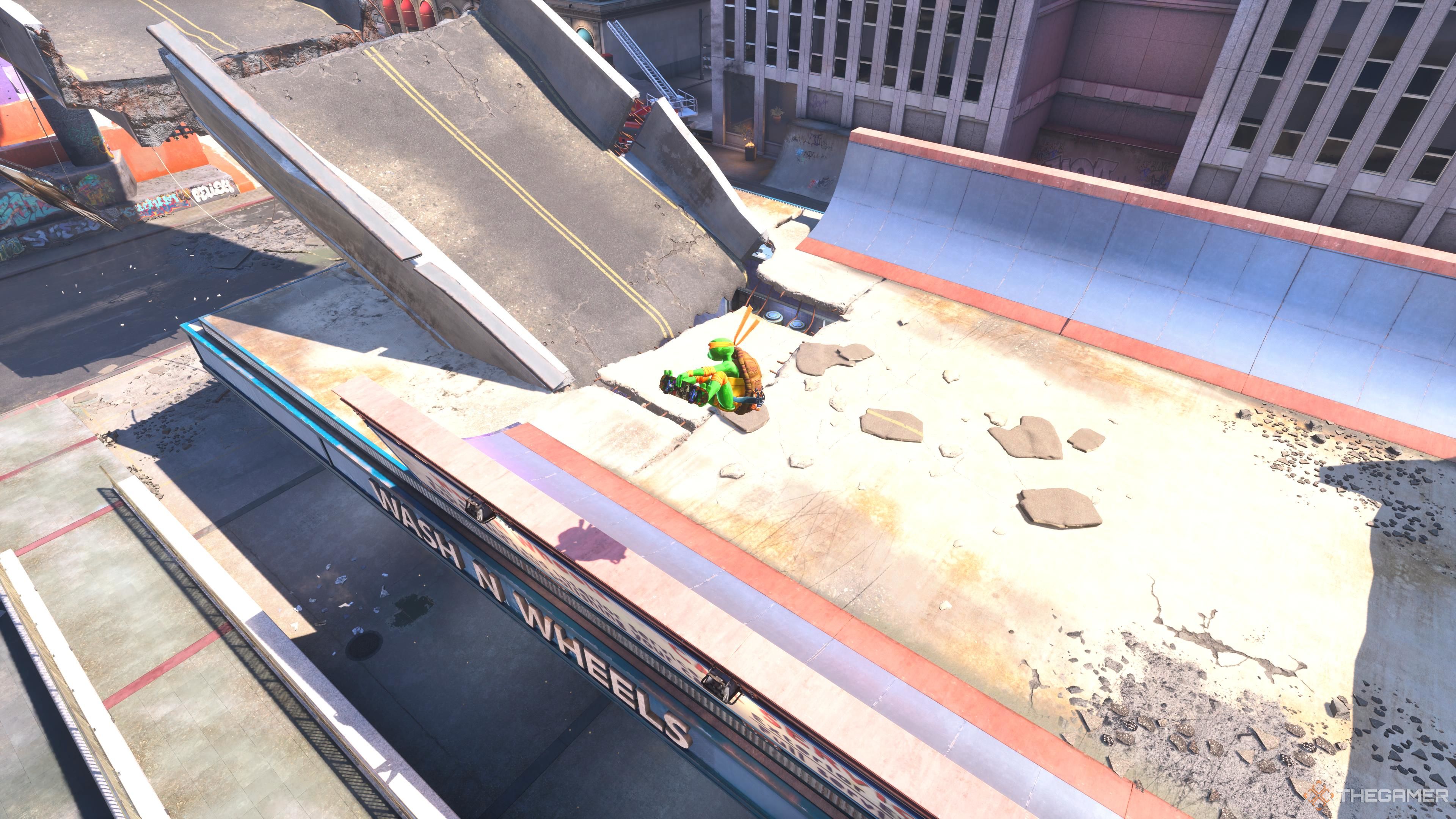 図書館の屋根に通じるケーブルを挽くと、倒れた高速道路セクションに飛び込むことができます。ここからできますハーフパイプに到達するためにそれを下ろします、または、できます屋上に沿って粉砕するためにランプから自分自身を起動します。