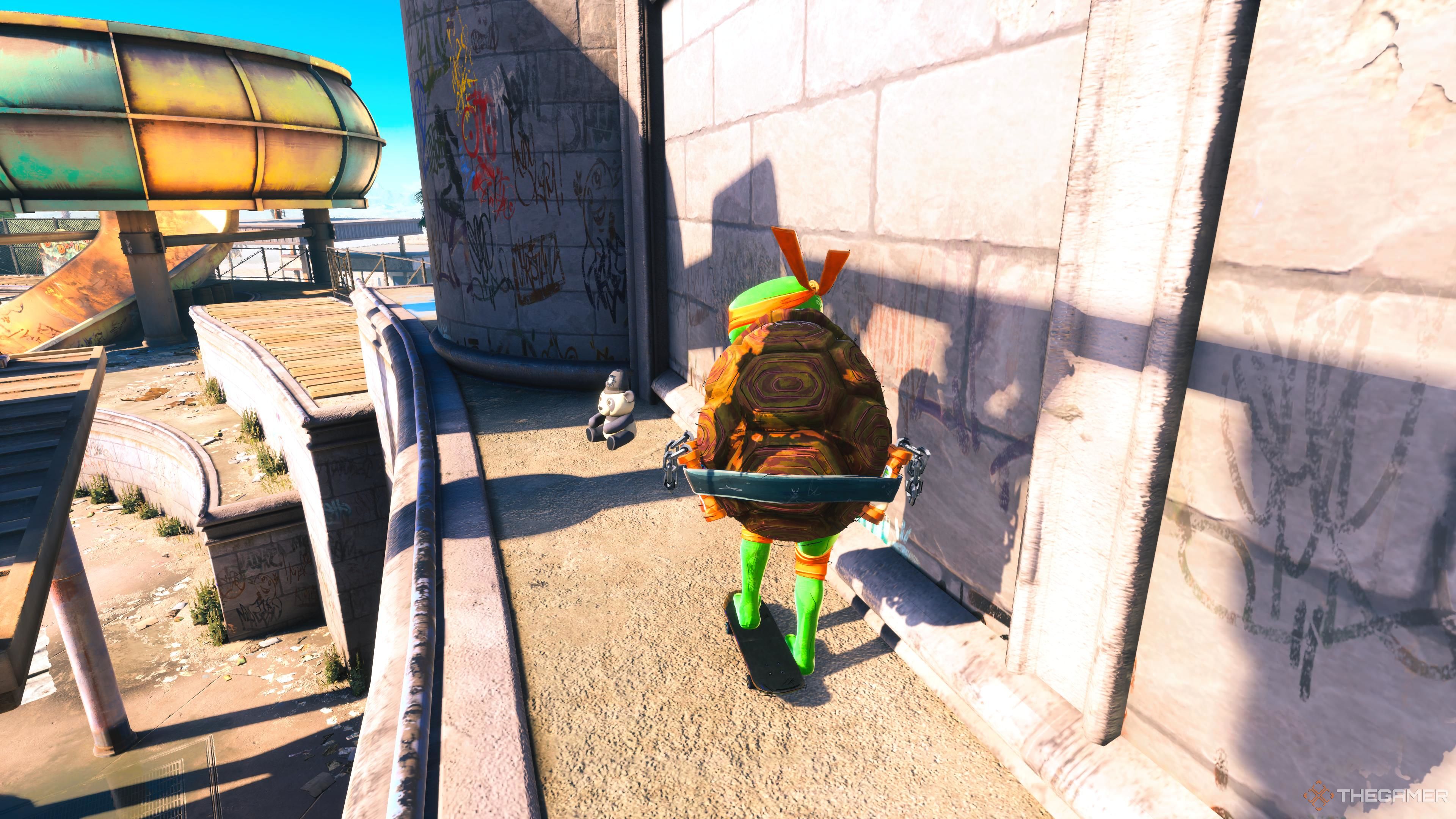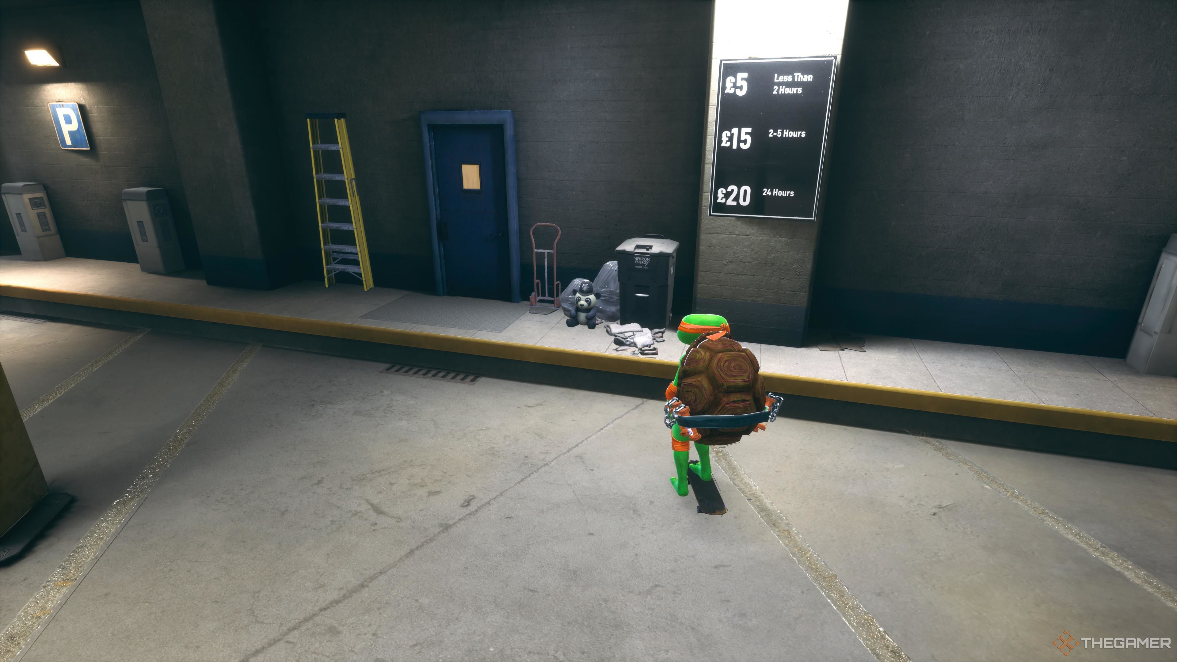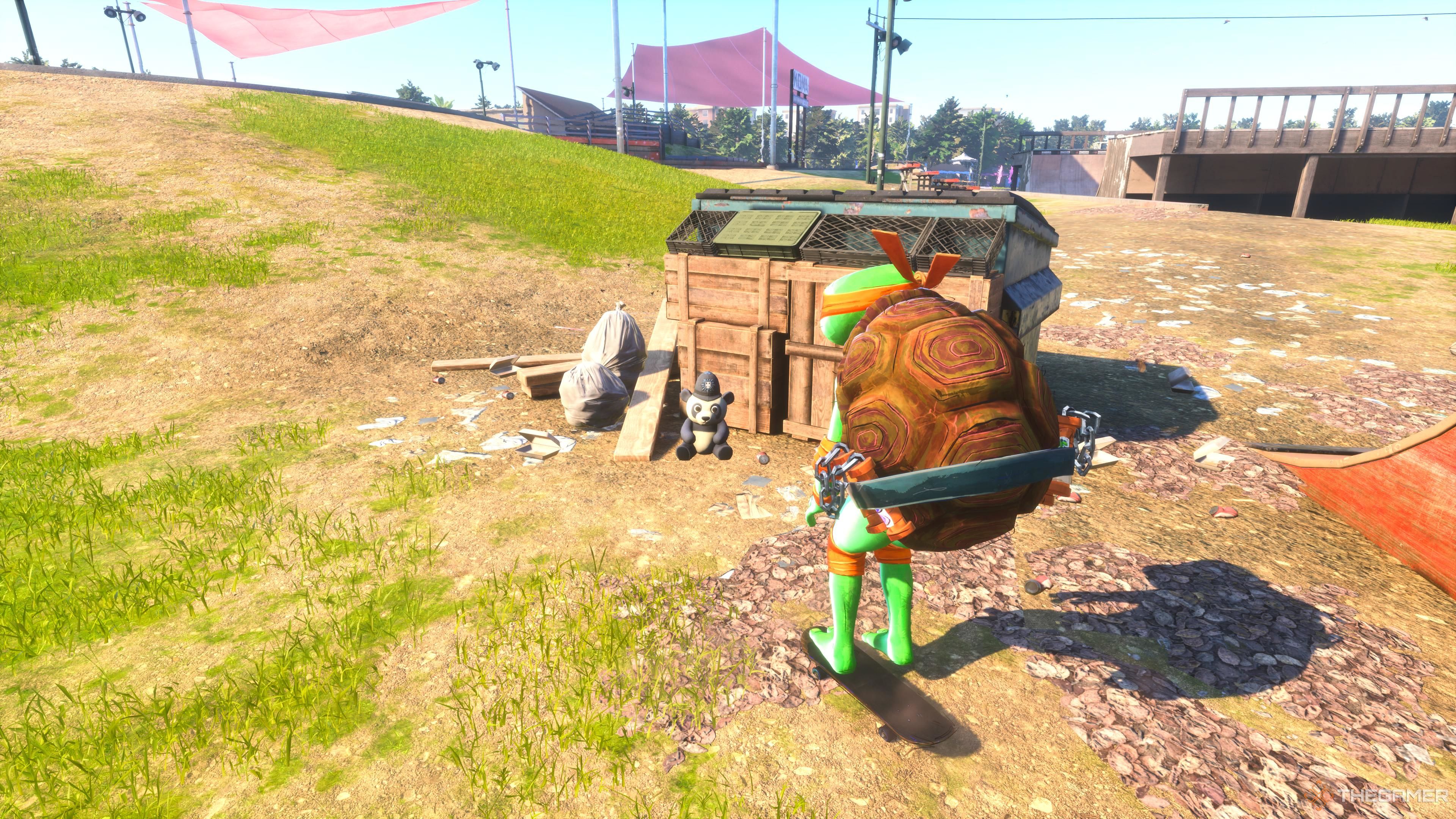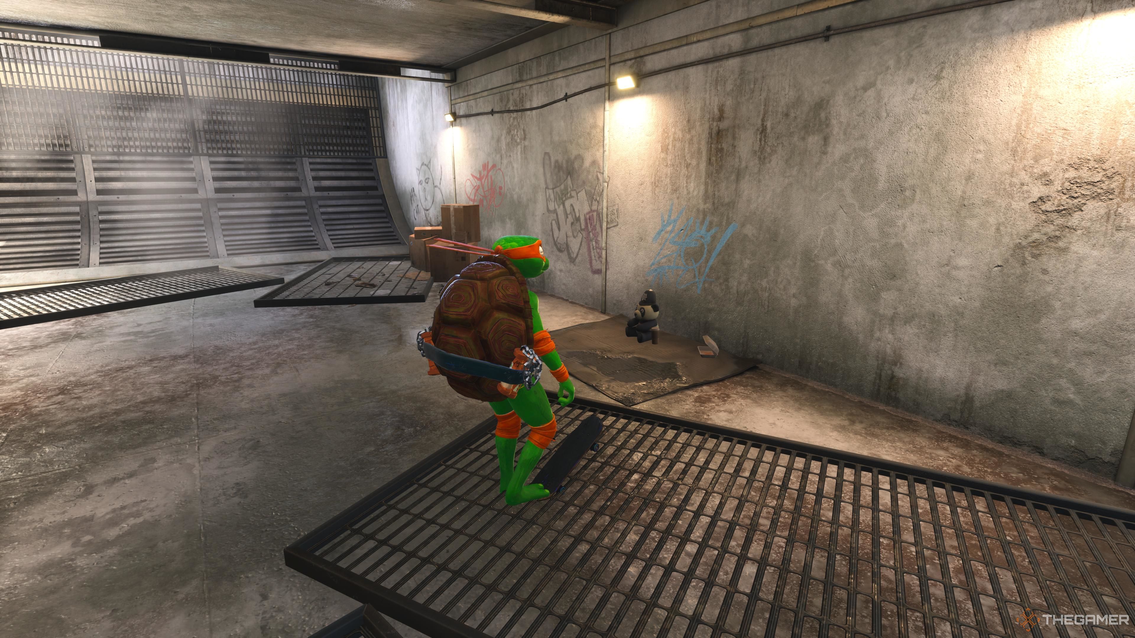 開始領域から、右に向かいます。床から天井までの大きな窓がある建物に向かって移動することに気付くでしょう。それらをバストし、反対側のランプを飛び越えます。今。地面にいくつかの格子帯が見えます。このエリアを囲むレールを見つけて、それらを開きます。これで、アンダーグラウンドロサンゼルスのハーフパイプにアクセスできます。パンダはこのハーフパイプの段ボールパッドに座っています。