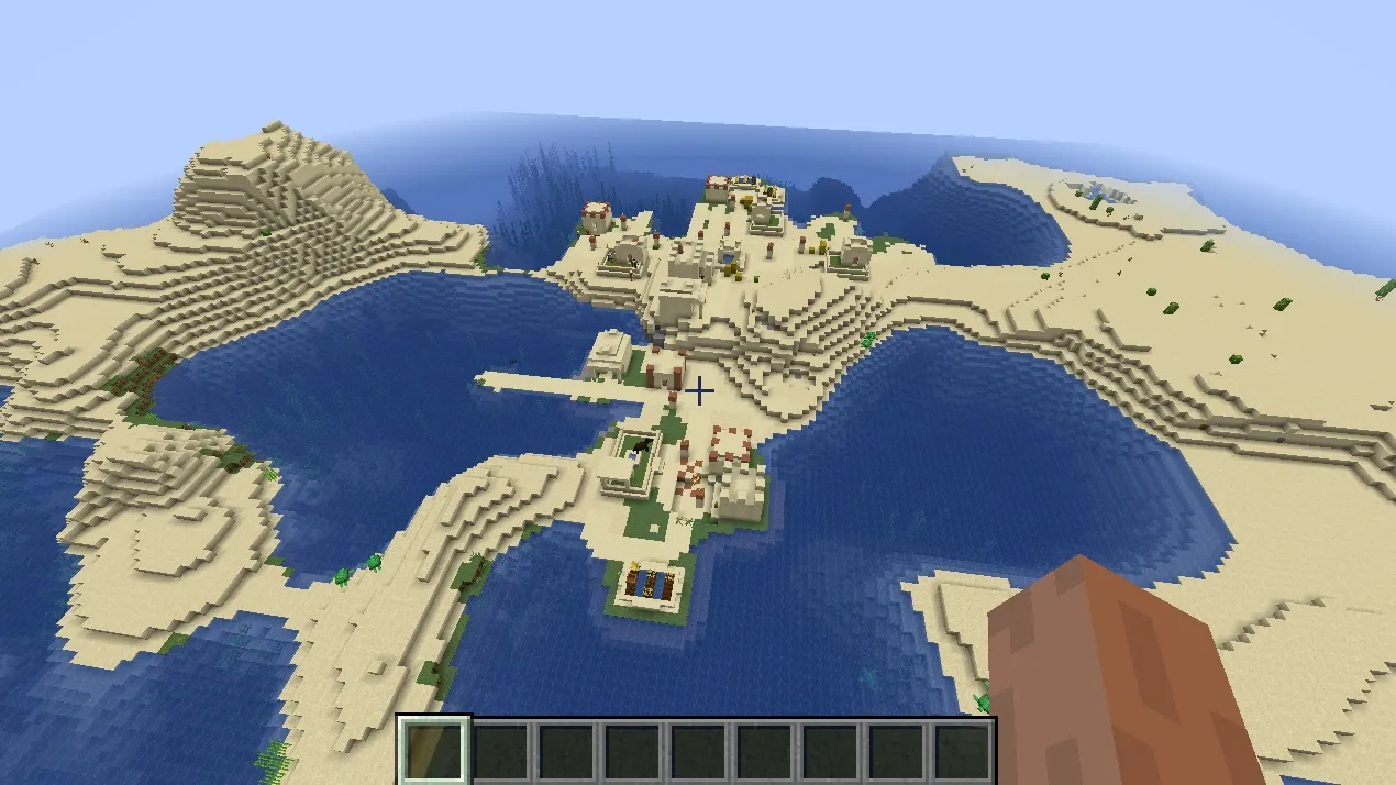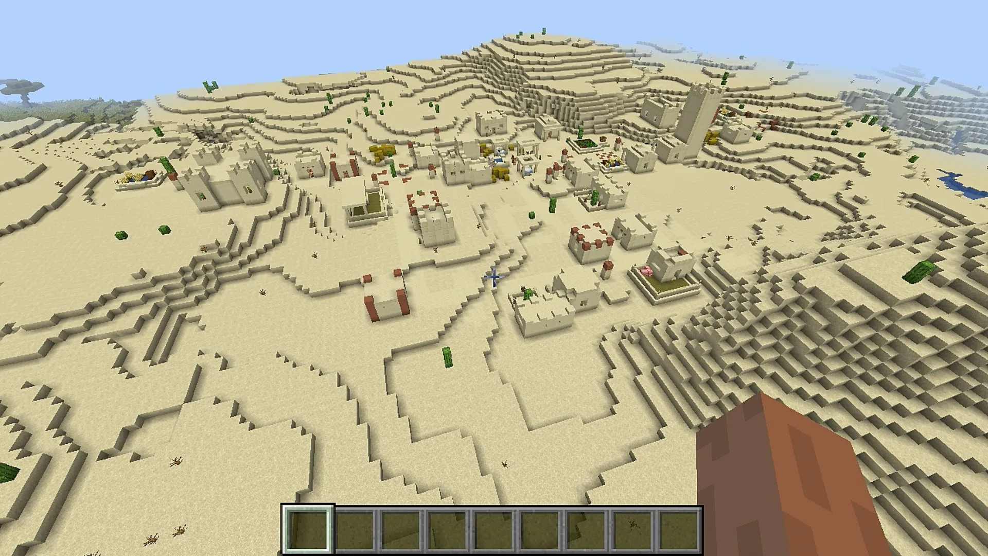 スポーンの直後に、300、 -500を調整します。そこには、小さな砂漠の村と激しい柱が隣同士に立っているのが見えます。