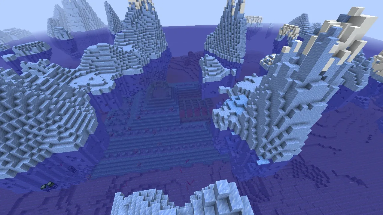 この種には、スポーンに二重の海の記念碑があります!海洋バイオームは完全に凍結されているため、両方の構造は、座標-350、200および-450、-250の重い氷山で覆われています。