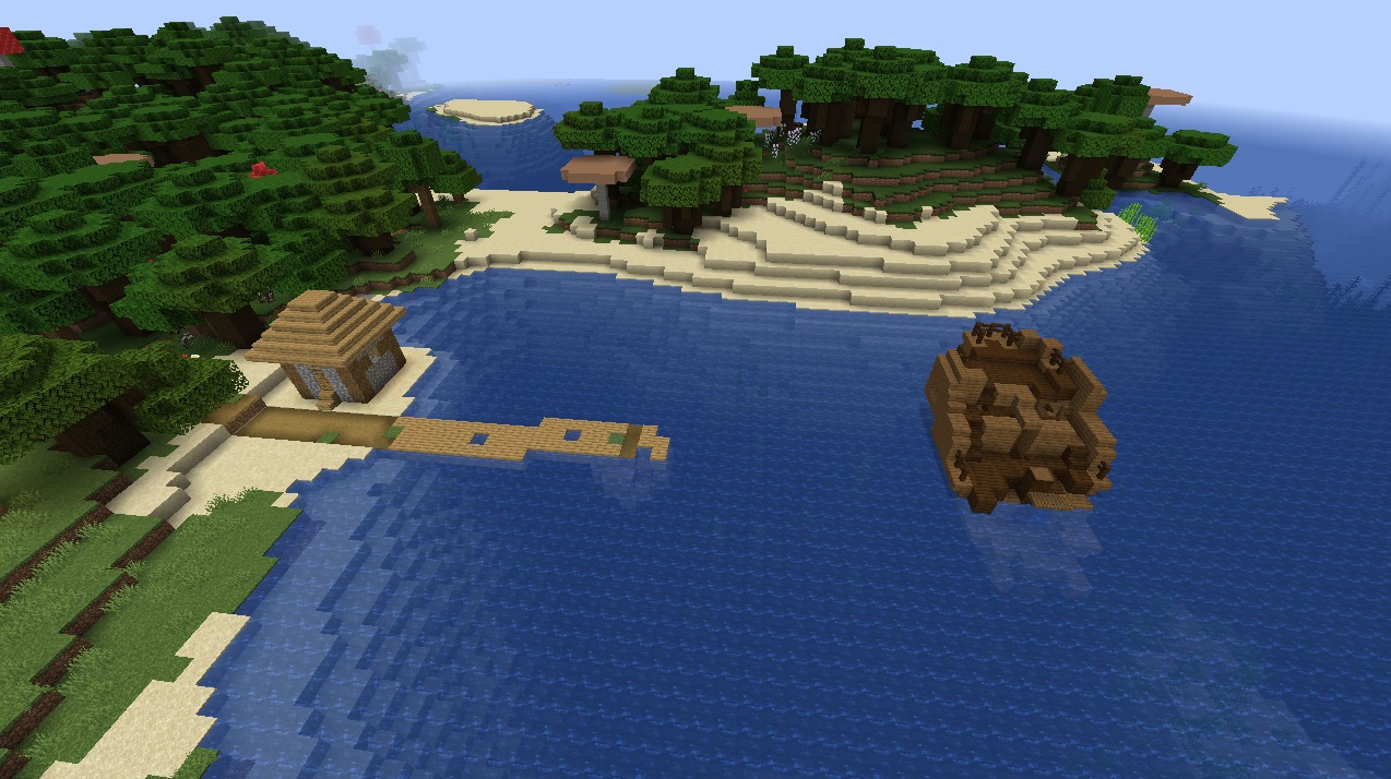 出現した直後、東に向かい、海のバイオームを渡ります。 Coordinates 1100、-200では、砂漠の村、寺院、大規模なサバイバル島のビーチに難破船があります。