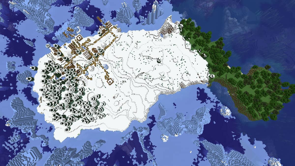 Ice Spikes Biomeは、以前のMinecraftバージョンほど珍しくなく、このようなクールな種を見つけることができます。北西方向の400ブロックをはるかに超える伸びます。南西に2番目の村があり、北東に地下室のあるイグルーがある氷のスパイクに隠された雪の村の隣に出現します。