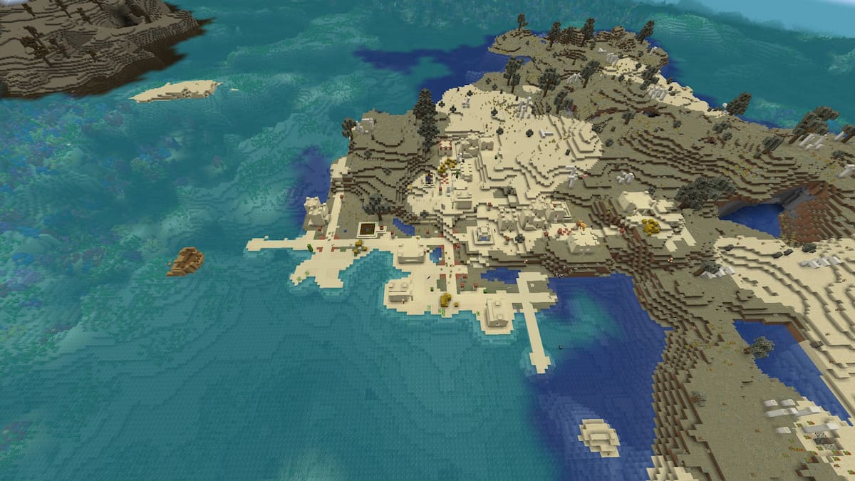 このMinecraftの種子は、膨大な数の露出した骨の遺物を備えた最も荒涼とした乾燥地バイオームの1つにあなたを生み出します。実際のスポーンポイントは、2つの渓谷の間にあります。それらの周りを歩き、海に向かって海に向かい、海岸に素敵な砂漠の村を見つけます。ここから海に向かって見ると、露出した難破船とカラフルなサンゴ礁が明らかになります。