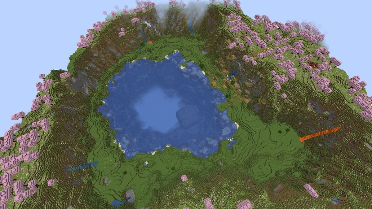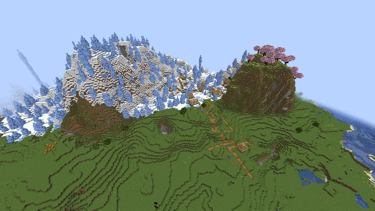 このMinecraftの種は、ゴージャスなチェリーグローブパッチの真ん中にあなたを産みます。驚いたことに、私はここに2つの村があり、チェリーグローブにある村には鍛冶屋さえあります。この種の北部地域を探索していたとき、私は座標X:-400 Z:-320で牧草地の真ん中に3番目の村を見つけました。