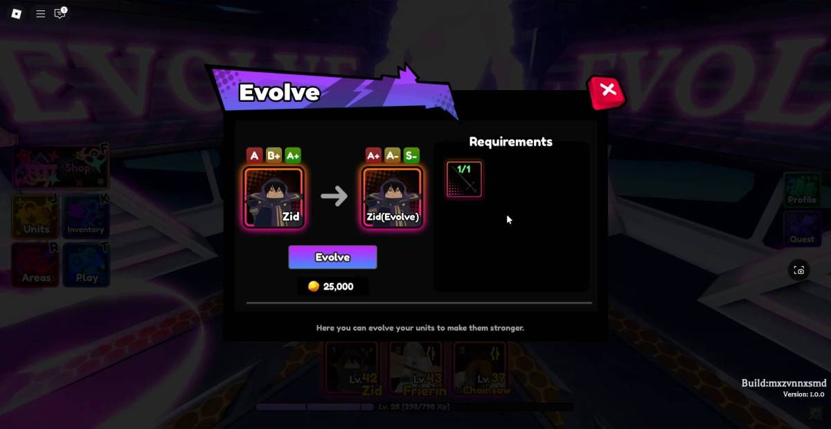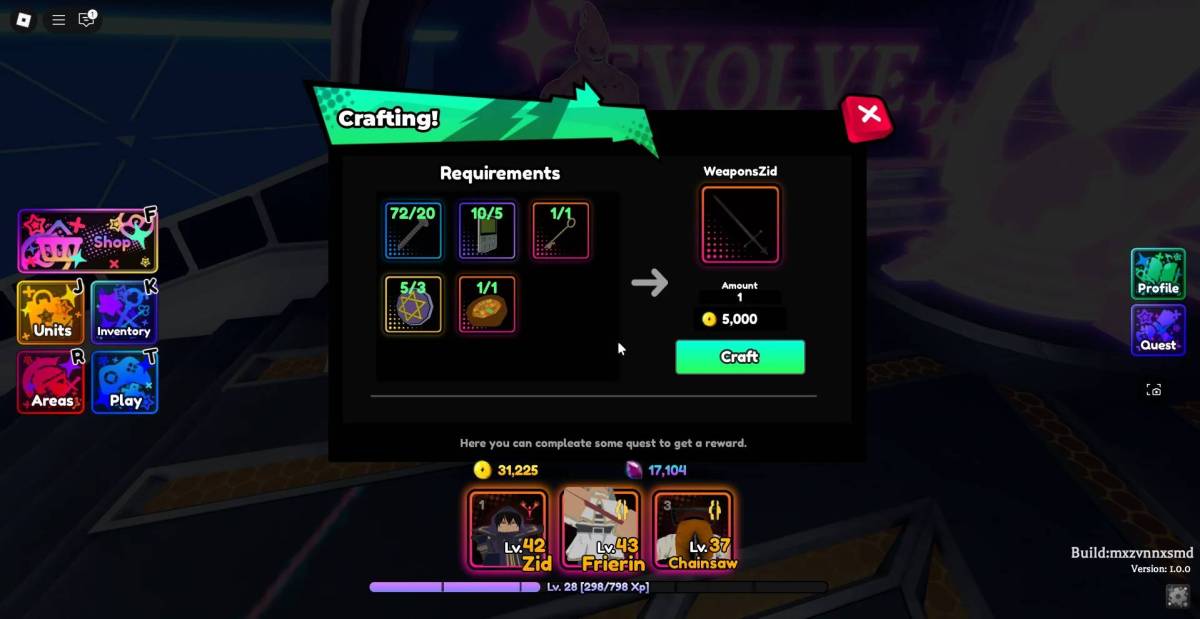エボリューションアイテムを作成できます、アニメサガの進化するユニットに必要な、で クラフト(期日の場合)メインロビーのNPC。進化アイテムを作成するには、最初に特定の素材と少しの金を集める必要があります。襲撃を行うことで、これらの材料のほとんどを耕すことができます、一部はでも利用できますゴールドショップ。