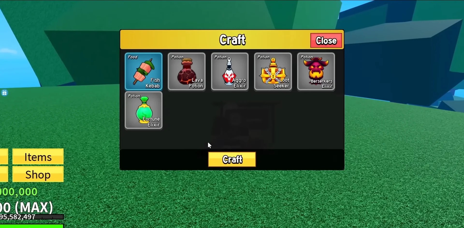 | Aggro Elixir | •50,000ドル •珍しい魚X3 •フラグメントX10 •魚類のX2 •木製の板X1 | •近くの敵にあなたを標的にするように強制します。 |