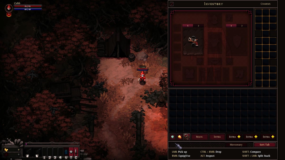 押してキャラクターの在庫を開くことができますc(デフォルト)HUDの左下隅にあるバーの剣アイコンをクリックすると。そこでは、ヒーローが使用しているギア、すなわち武器、手袋、チャーム、遺物などをチェックして編集できます。下半分には、メインタブに宝石、ポーション、キーなどのアイテムが表示されます。あなたはできる必要に応じて、さらにスロットを購入してください追加をクリックして。