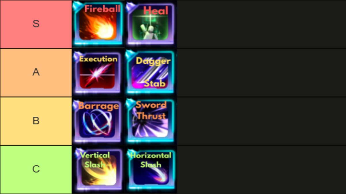![]() | 剣の推力は、より多くの損傷が与えられているにもかかわらず、あなたの通常の剣攻撃のエミュレーションです。 | ソードスラストは、すべての戦闘シナリオでの平均パフォーマンスのため、B層のスキルです。これは、冷却期間が大幅に短い場合、A層のスキルになります。 |