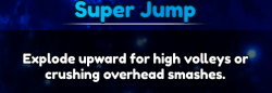 ![]() | •アクティブになって、劇的に高いジャンプを行います。 | •強力なスパイクを行うために敵のロブに対して使用するために本当に便利な動き。 •敵があなたの下にショットを撃つことができるので、スパムしないでください。 |