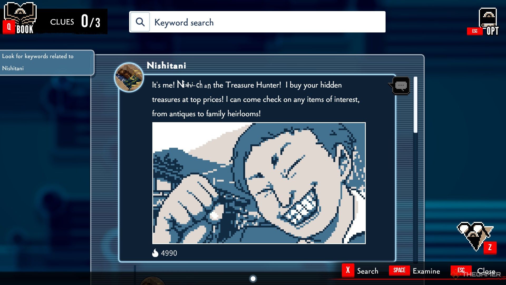 - 最後に、「ニシタニ、別名トレジャーハンターの西ちゃんは、マヤサキの仲間でありビジネスパートナーであるふりをしているが、実際には奴隷のような扱いを嫌っている」というコメントを選択してください。これはあなたに最後の手がかりを与えます。