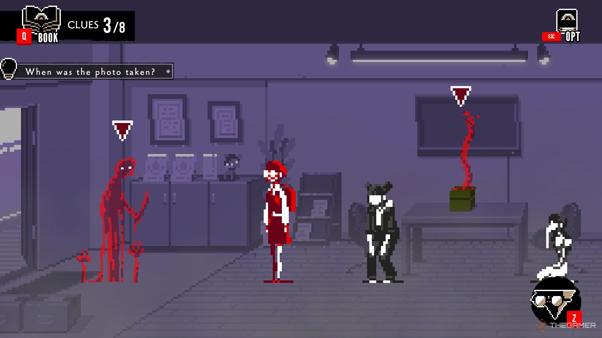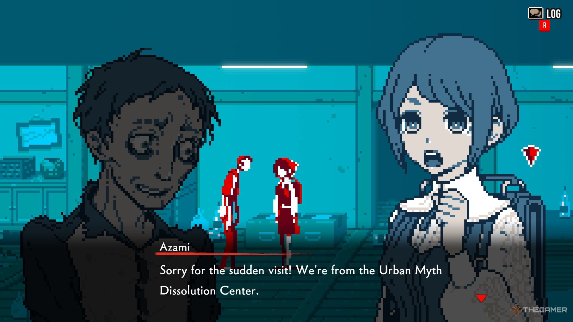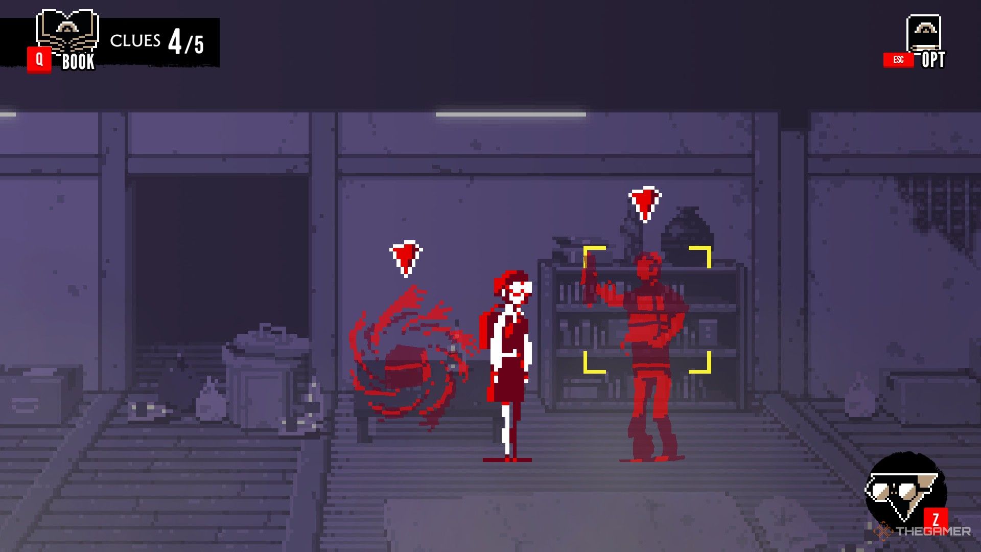 - 倉庫に戻り、眼鏡をかけます。赤い箱の影のある人物と対話し、箱の横に本を持っている影の姿と対話し、両方のオプションを選択します。