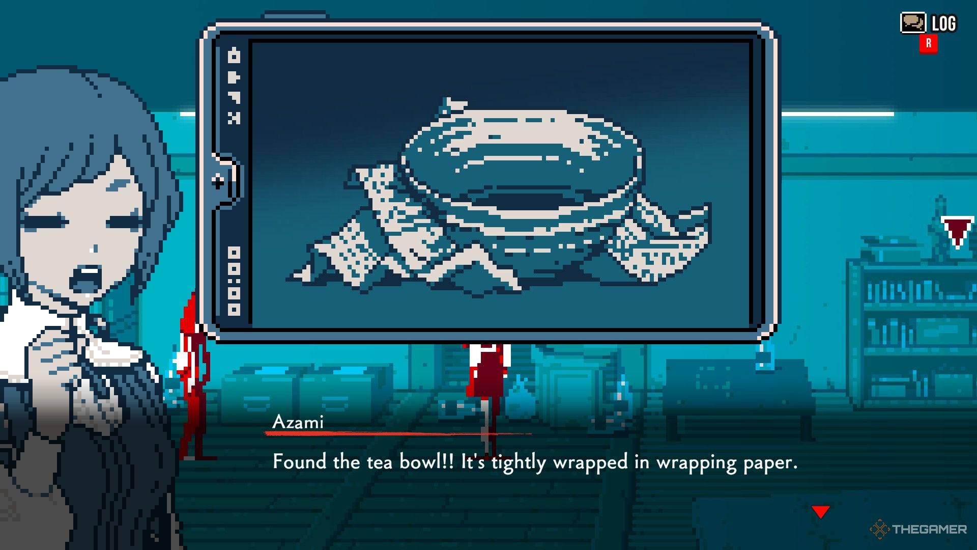 - 右端の棚に戻りますが、今回は木製の箱と対話し、すべてのアクションを排出します。次に、ニシタニと話して、ティーボウルについて尋ねてください。