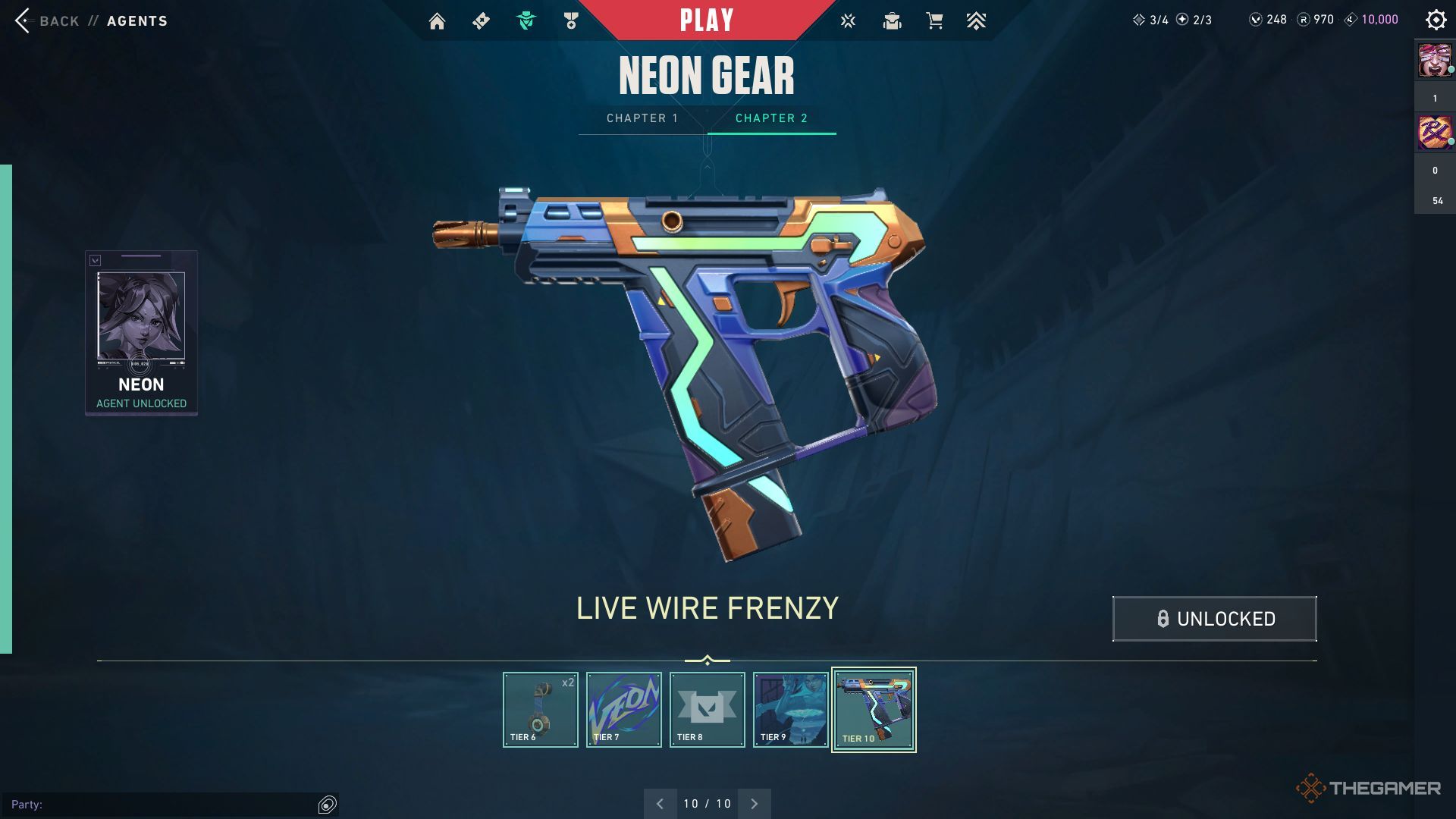 ヨルと同様に、ネオンの契約には、わずかなアニメーションを備えた2つの化粧品もあります。これらは、Tier 6のSurge Protector Buddyであり、Tier 10のライブワイヤーフレンジーです。どちらも同様のアニメーションを備えています。これらのアニメーションでは、化粧品の強調表示された部分が片側から他方にシフトし、色も黄色から青まで継続的に変化します。