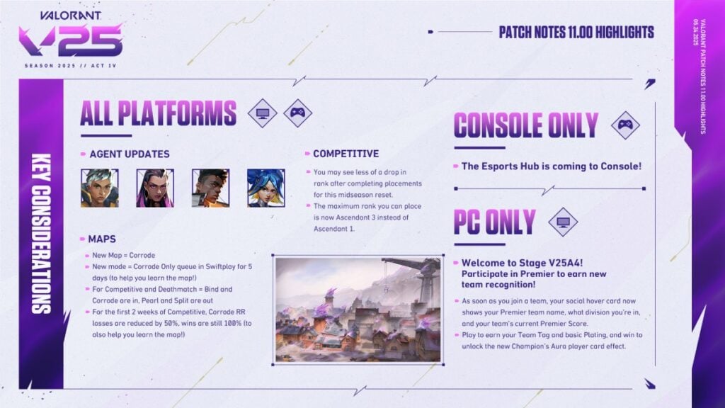 Valorant Patch 11.00のメモが発表されており、エージェントバフとナーフのすべての更新と、シーズンV25の新しい行為に伴う新しいマップがあります。