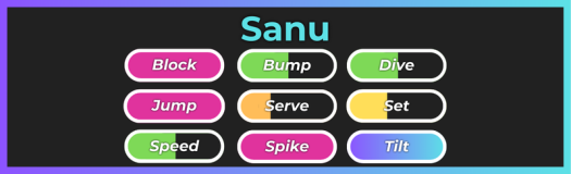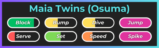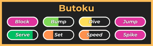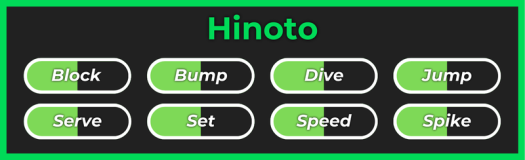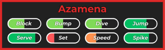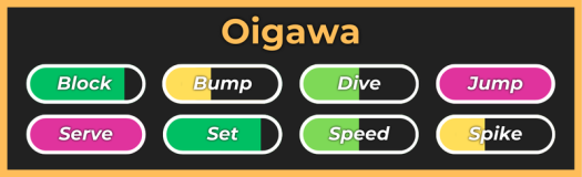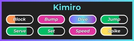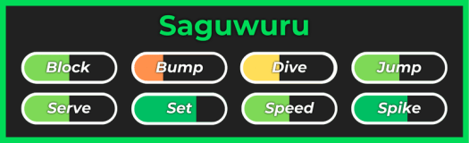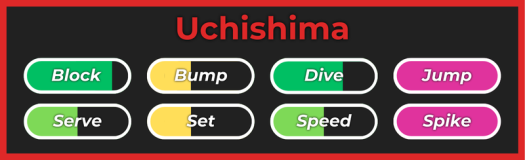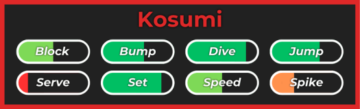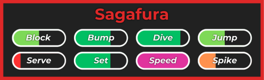 ![]() | ブロック:3 バンプ:10 ダイビング:10 ジャンプ:7 仕える: 8 セット:6 スピード:10 スパイク:4 | •ダイビングボタンを持っているときは、スーパーダイビングできます。 •パッシブ:ダイビングヒットボックスの増加。 |