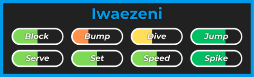 ![]() | ブロック:8 バンプ:2 ダイビング:4 ジャンプ:10 仕える:5 セット:7 スピード:3 スパイク:5 |
