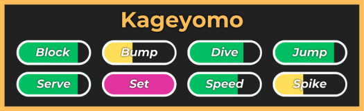 ![]() | ブロック:9 バンプ:4 ダイビング:8 ジャンプ:9 仕える:9 セット:10 スピード:7 スパイク:4 |