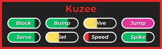 ![]() | ブロック:5 バンプ:5 ダイビング:4 ジャンプ:5 仕える:5 セット:3 スピード:3 スパイク:7 |