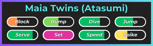 ![]() | ブロック:9 バンプ:4 ダイビング:4 ジャンプ:10 仕える:2 セット:5 スピード: 3 スパイク:10 | •OSUMAとAtasumiをRで切り替えることができます。 •Osumaはスパイクとブロックに優れています。 |