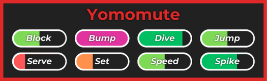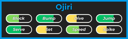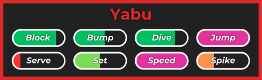 ![]() | ブロック:6 バンプ:5 ダイビング:4 ジャンプ:7 仕える:1 セット:5 スピード:3 スパイク:2 |