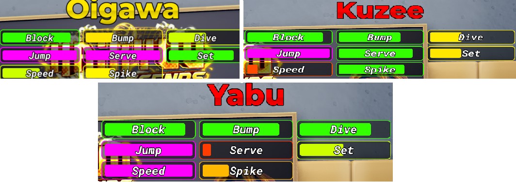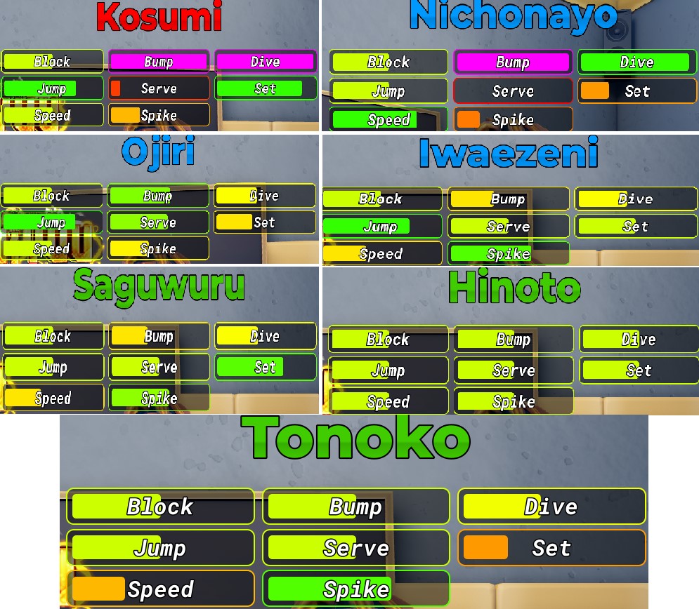 | Bokuto | 秘密のスタイルであるサヌとは別に、ボクトは、ブロック、ジャンプ、スパイクの3つの重要なスキルの最大の統計を提供する唯一のキャラクターです。これに加えて、彼のサーブも例外的であり、彼はバレーボールの伝説で最高の全体的なピックの1つになっています。 |