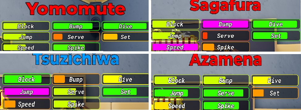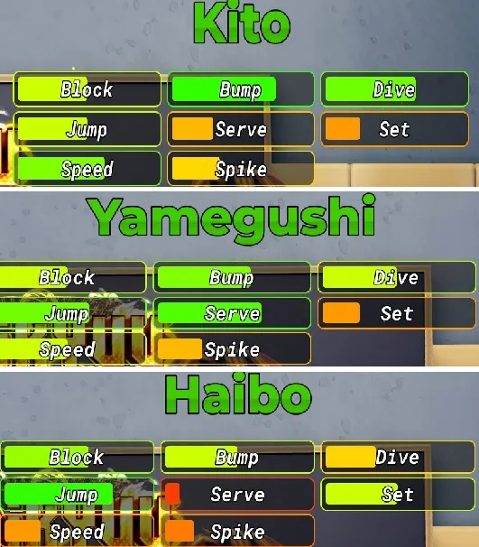 | サヌ | ティルトと呼ばれる新しいスキルを備えた4つの最大統計を提供します、サヌのみのロックを解除します。新しい能力により、キャラクターを手動で傾けて、スパイクにより多くのパワーを追加できます。たとえば、スパイクにジャンプしているときにWを押すと、キャラクターが前方に傾けられ(頭が下に向かって)、ボールを駆り立てて地面との接触をより速くします。これに加えて、横向きの傾き(AおよびDキーを使用)により、Hitboxがわずかに大きくなり、ボールのブロックを改善します。 |