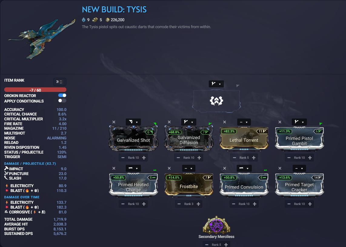 ティシシスは、ターゲットに埋め込まれた爆発的なダーツを発射し、短い遅延の後に腐食性のドットに爆発する半自動ピストルです。この武器には、二次的なベースダメージがありますが、50%のベースという不条理なステータスチャンスがあります。発射体爆発は、3秒間に1秒あたり27件の腐食性ダメージを与え、ベースショットの50%のステータスチャンスを継承し、良いビルドで豊富な数のステータスの病気につながります。