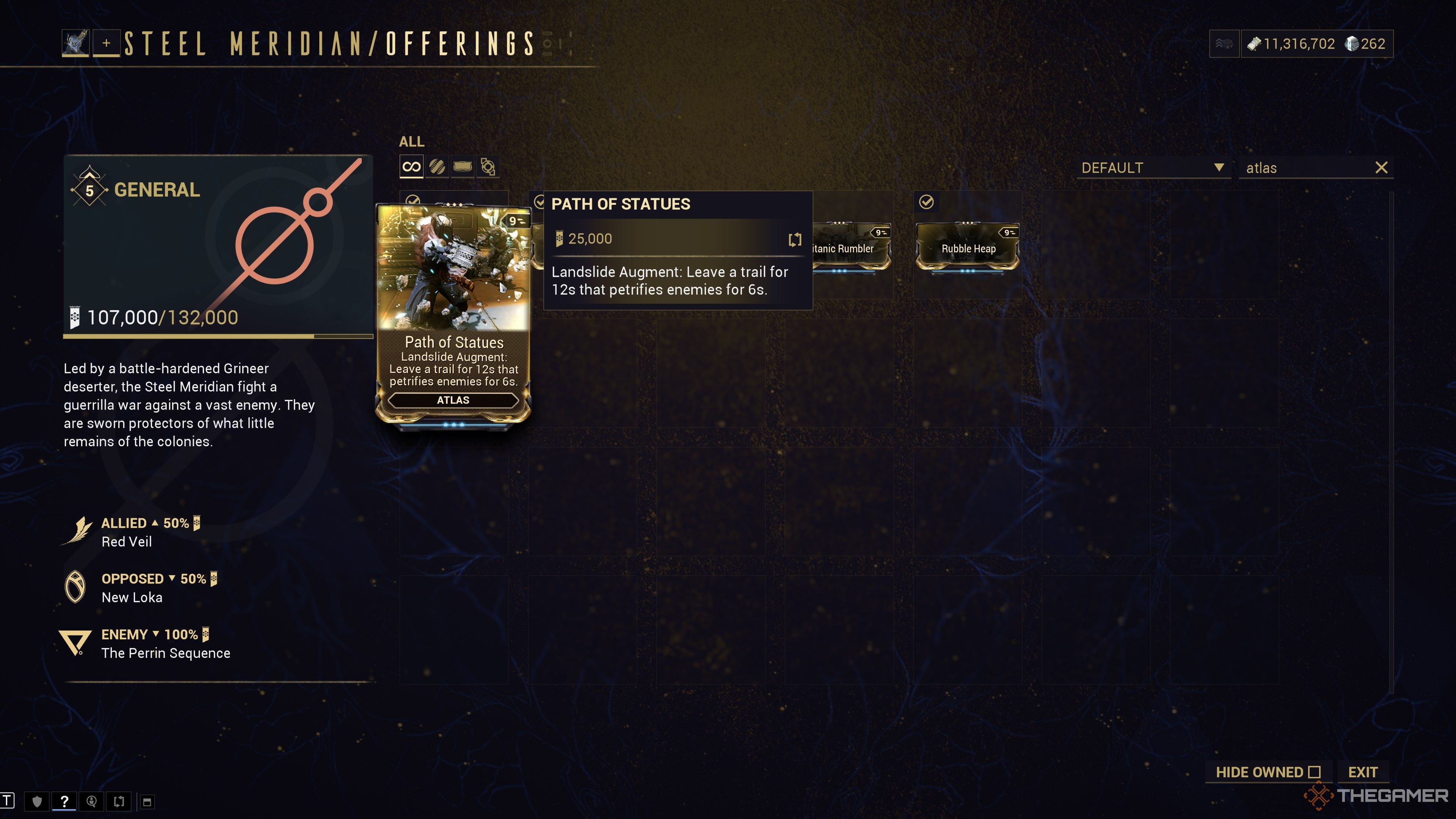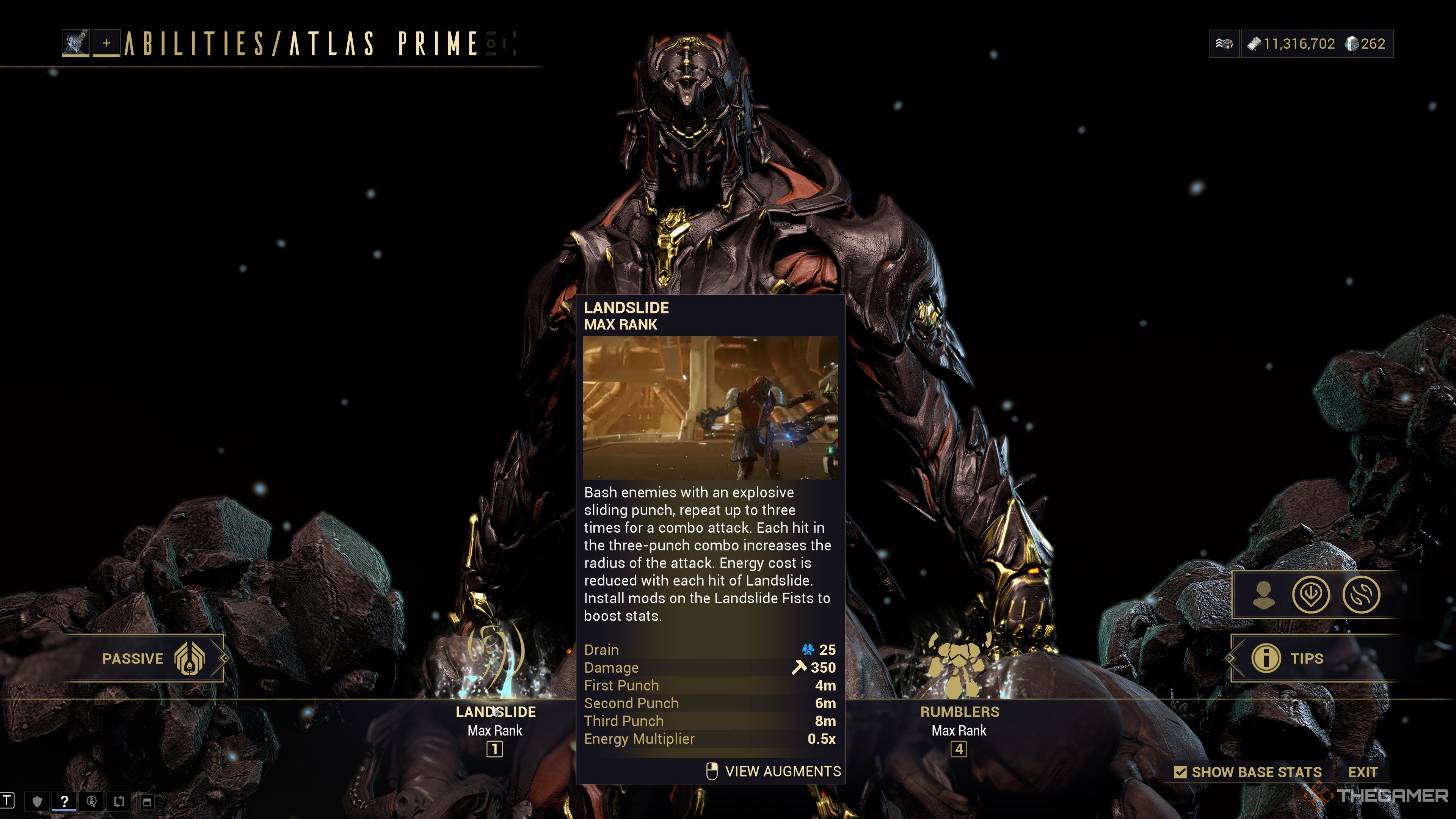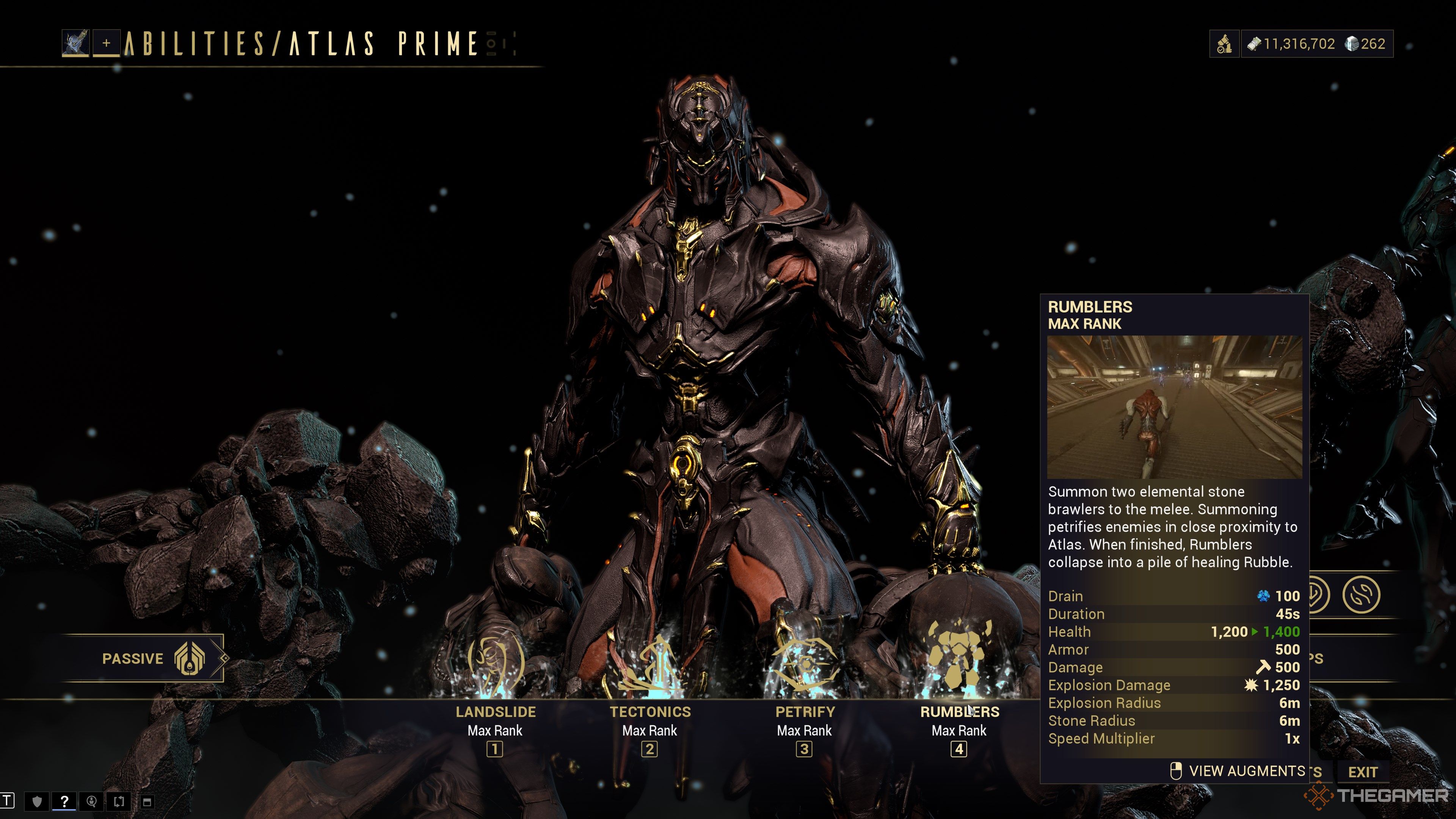 Atlasは、6つのAugment Modにアクセスできます。 Rumbleを除くと、すべての増強がから得られます鋼の子午線および赤いベールシンジケート。これらのmodを購入するためにどちらのシンジケートでも最大ランクである必要があり、それぞれが25,000の立場になります。または、他のプレイヤーからこれらのMODと交換することもできます。