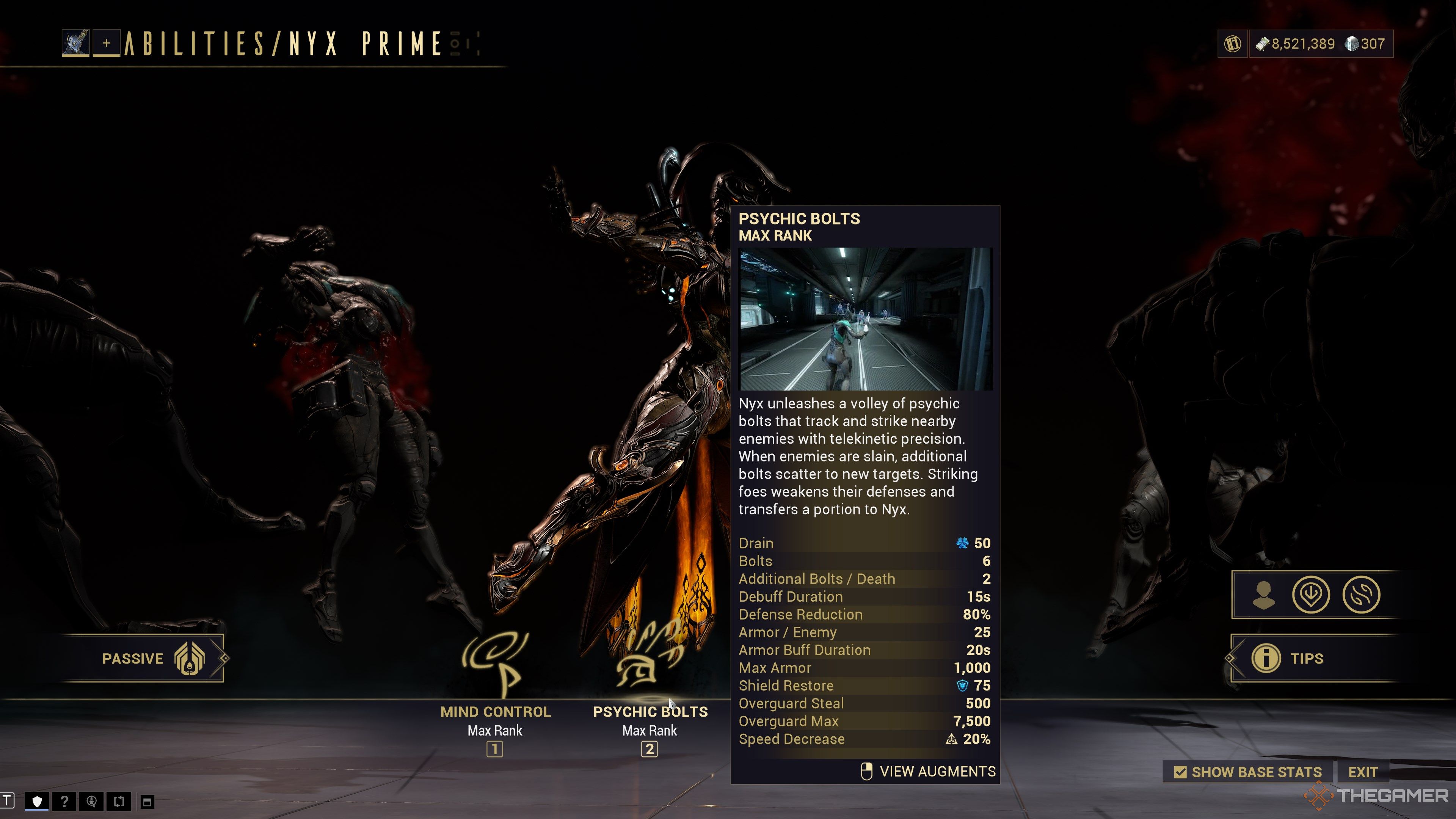 NYXは、ボルトが敵にタグを付けたとき、能力の強さに影響される最大までに、剥がれた鎧、盾、およびオーバーガードの一部を彼女自身のものとして獲得します。 増強せずに、サイキックボルトは、一度に最大6人の敵をタグ付けする場合があります。