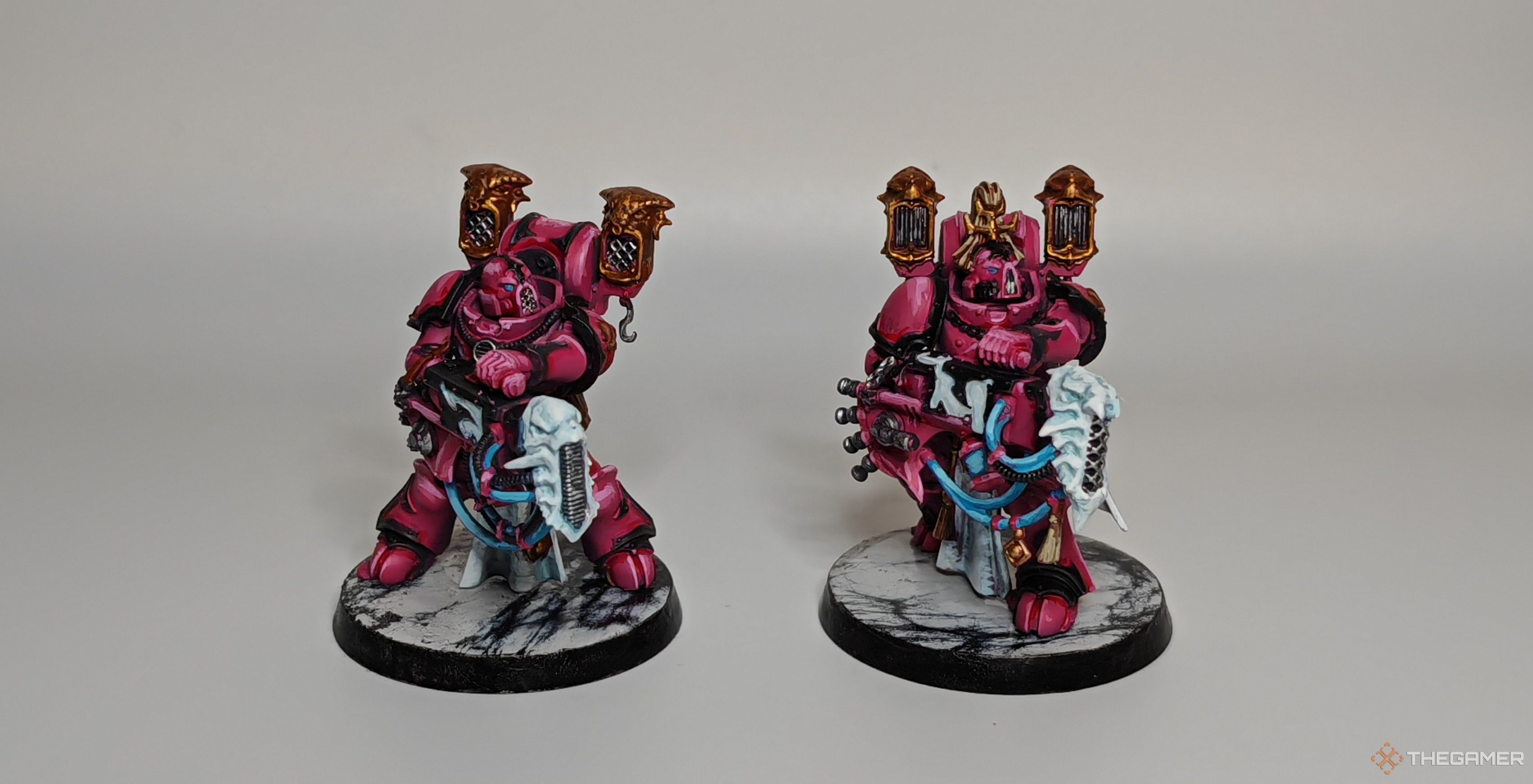 私はピンクの鎧で最も多くの時間を過ごしました。それは、より多くの皇帝の子供たちと強調する前に、ドゥームファイアのマゼンタのコントラストと皇帝の子供のミックスで覆われました。その後、詳細を追加し、顔、ベルト、一時的な道具を塗装し、完成したと呼びました。私の騒音海兵隊員は明るく、カラフルで、洗っていない。