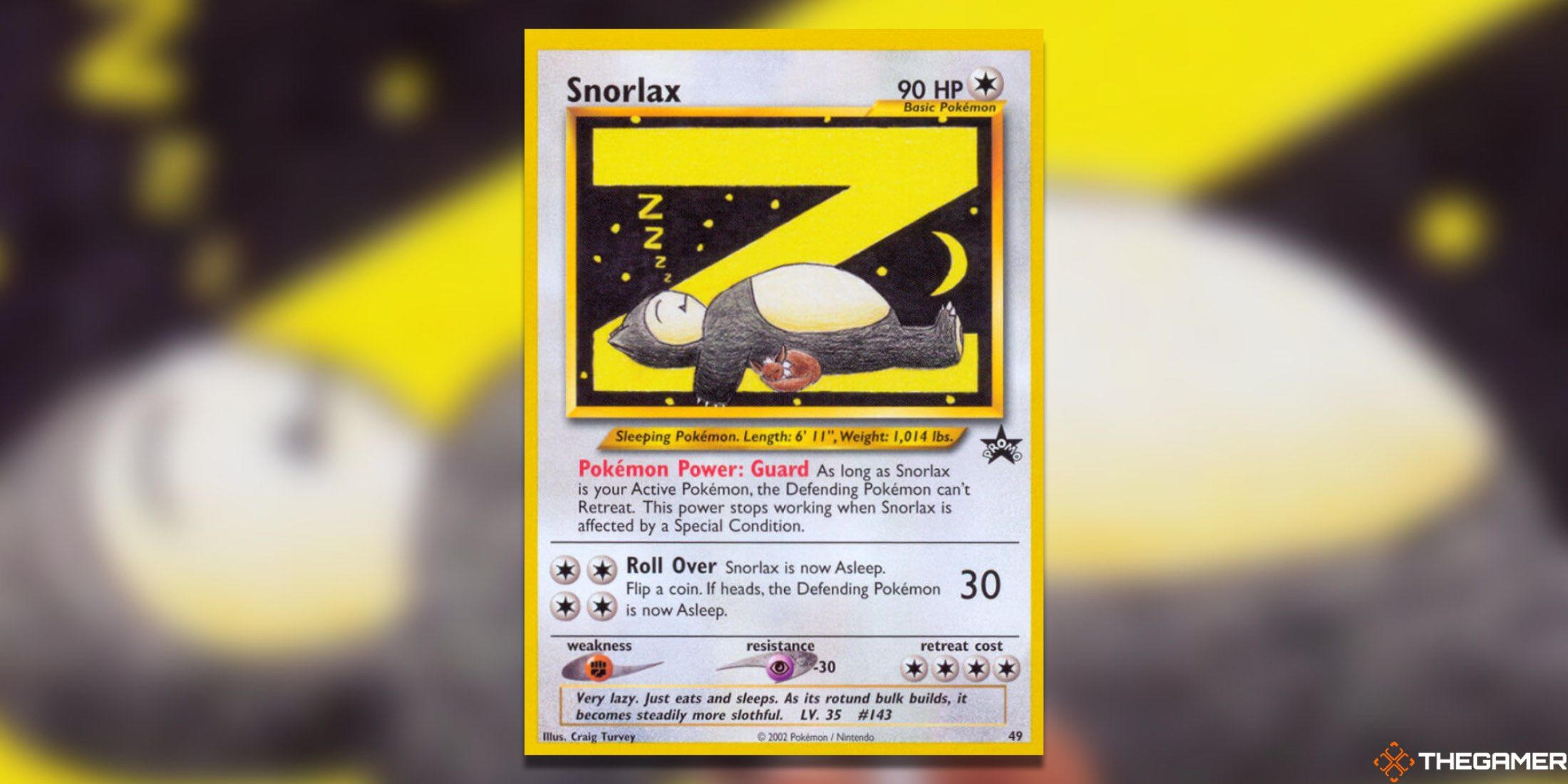 Snorlaxが常に眠っていることは秘密ではありません。また、この巨大な障害に出会ってからずっと続いています。このヒステリックなプロモーションカードは、その事実に注意を喚起し、その背後に巨大な「Z」でスノーラックスの眠そうな性格に敬意を表し、その後いくつかの小さなものが続き、その安らぎの眠りを示します。